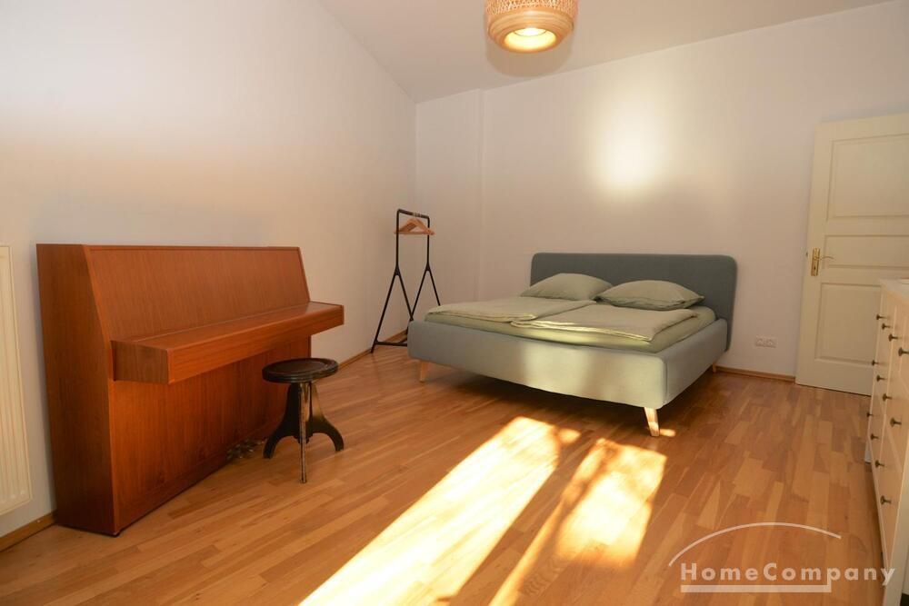 The bedroom impresses with a comfortable double bed and a piano, sure to delight music lovers. From here, you have direct access to the spacious bathroom with a bathtub, offering a perfect retreat. Additionally, there is a separate guest WC for added convenience.