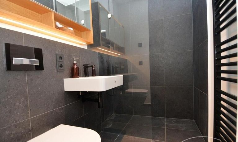 The apartment has a white built-in kitchenette with refrigerator, built-in stove, hob, dishwasher, cozy sofa, folding bed, dining table , woodden sideboard, black wardrobe. open shelf, comfortable armchair.