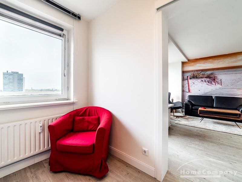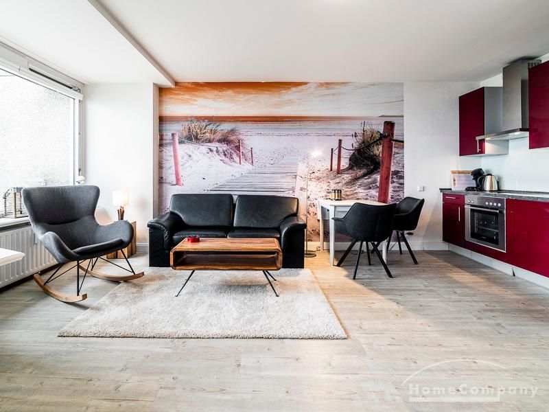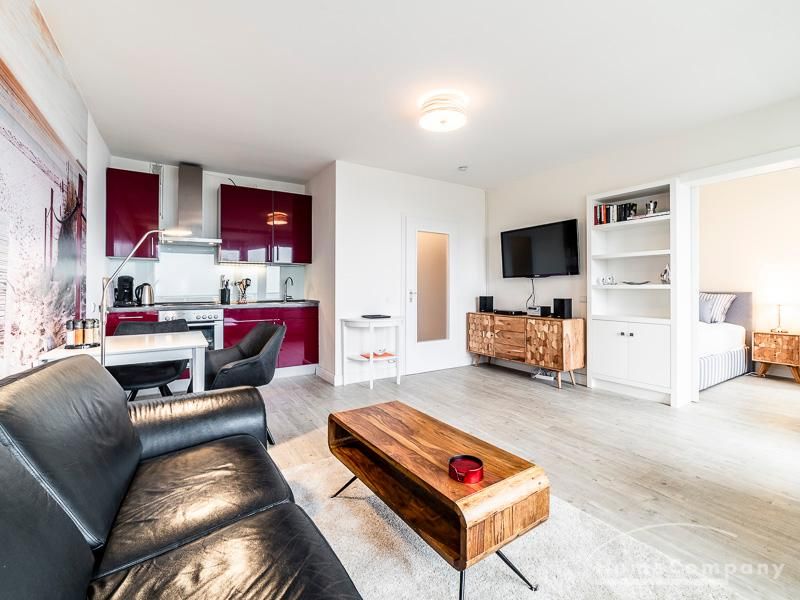 First-class furnished flat, central located in “Gorch Fock house” with Elbe view. The light living room with open kitchen and large balcony, a quiet bedroom and a modern full bath offer modern business people a home right on the Elbe. A laundry room with washer and dryer is available in the house. An underground parking space can be rented for € 100 additionally. The maximum clearance height to the underground car park is 1.95m.
