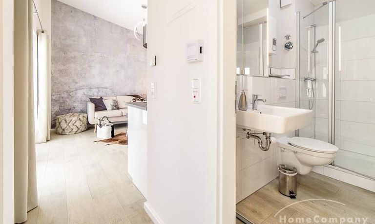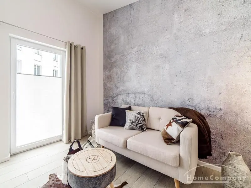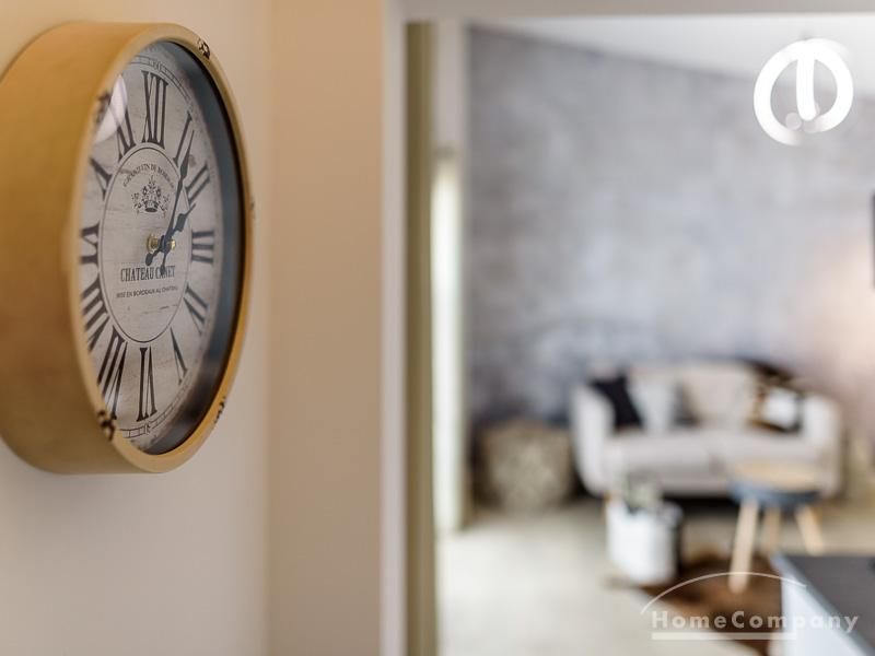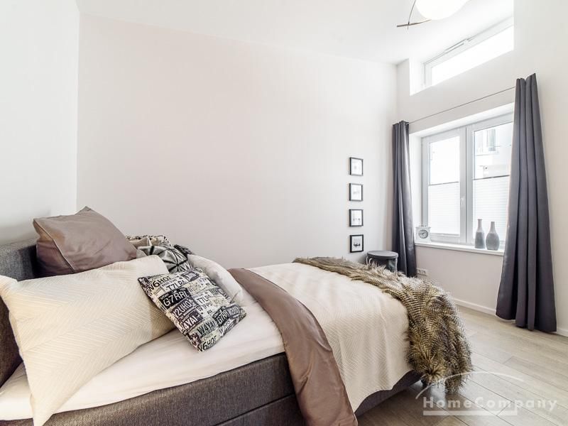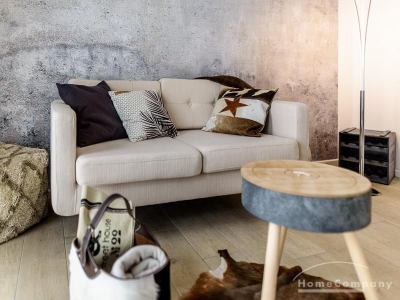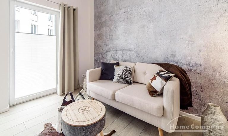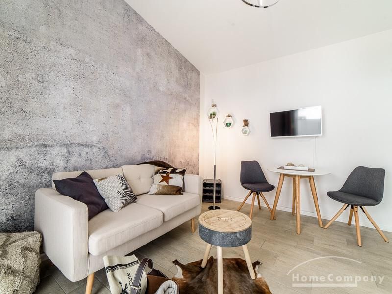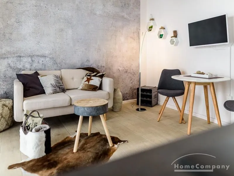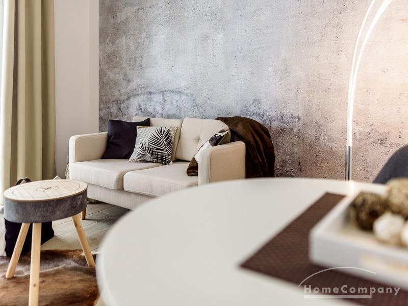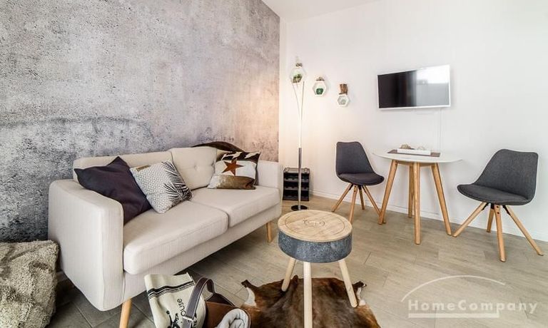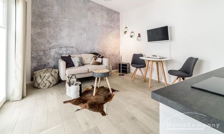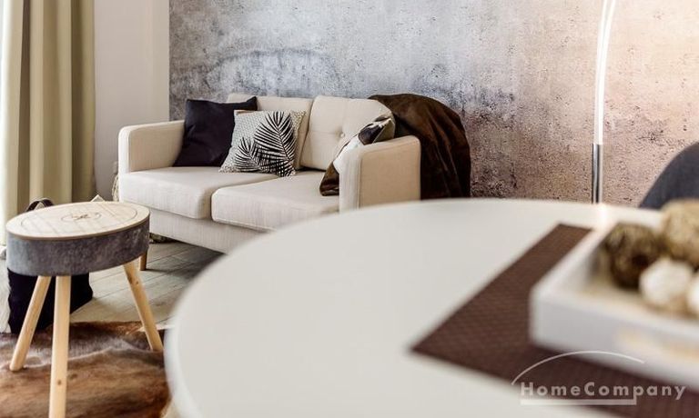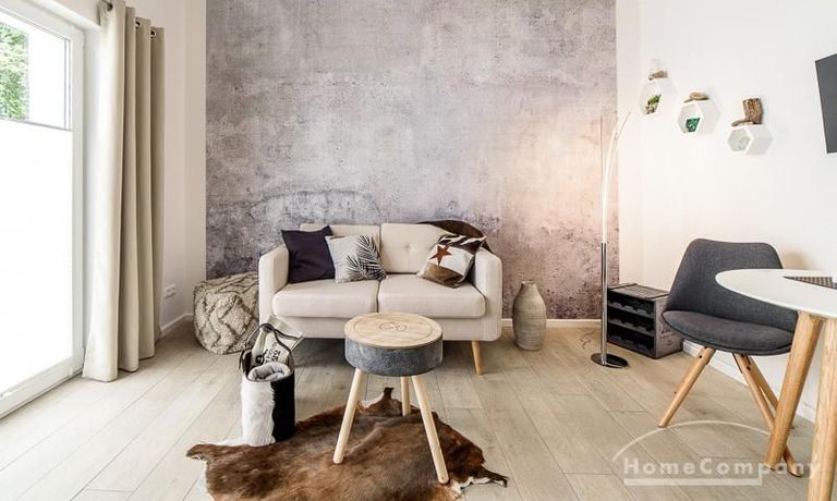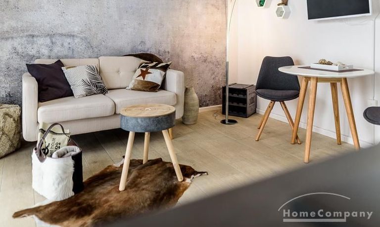 The apartment with floor heating is modern and harmoniously decorated. A bright sofa invites you to relax. A practical side table made of blue cotton, hemp rope and fir wood combines functionality with design and is a real sight. The wall design, the high, oblique ceilings and carefully chosen acceccoires lend the styling a contemporary business ambience. Other contrasting accents, such as the beautiful blessbock fur, an order basket with cozy additional sofa blanket and a fabric pouf complete the overall look. The open high-gloss kitchen is equipped with a washing machine, dishwasher and a Senseo coffee machine. The bright bathroom with underfloor heating, generous shower, scales and hair dryer offers every comfort. The bedroom is equipped with a 1.20m boxspring bed and a 2.70m wardrobe with additional inside drawers. Made-to-measure pleats, which can be adjusted in any position from the top and the bottom, offer a high degree of visibility and sun protection on all windows and provide for gently filtered, natural light in the room. Additional curtains create a pleasant ambience even in the evening hours. The apartment has a terrace and is located in the absolutely quiet inner courtyard of a little busy side street, only 1.2 km from Dammtorbahnhof and the city center.