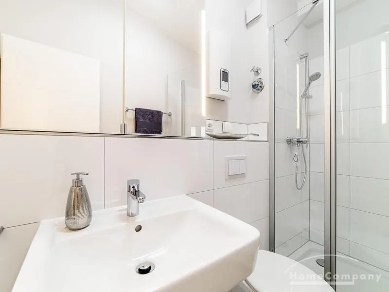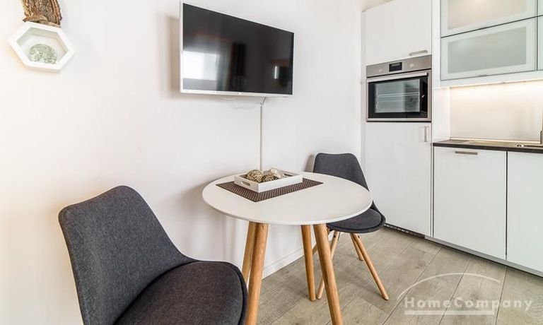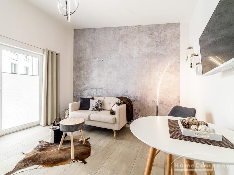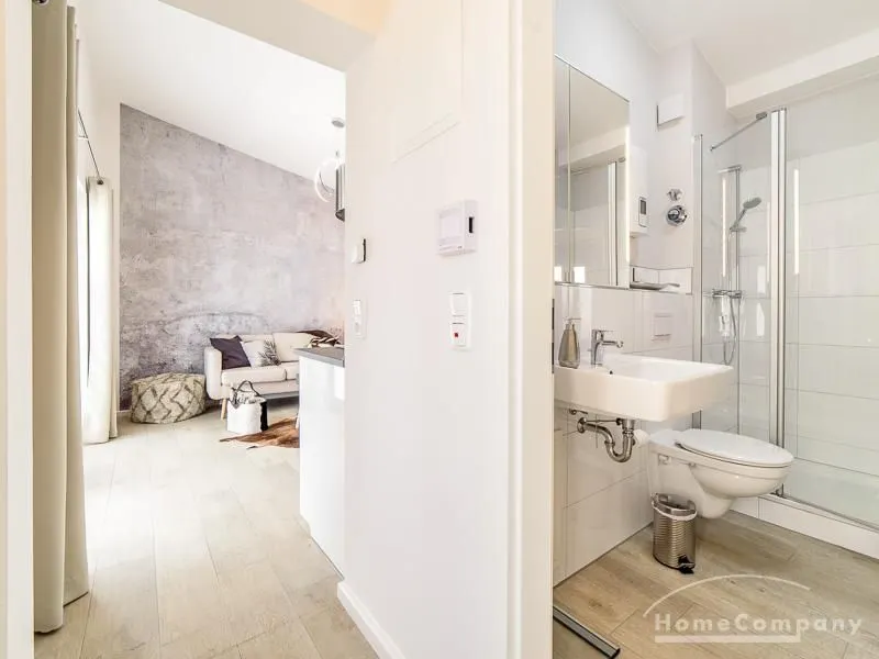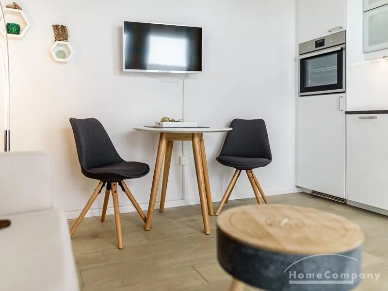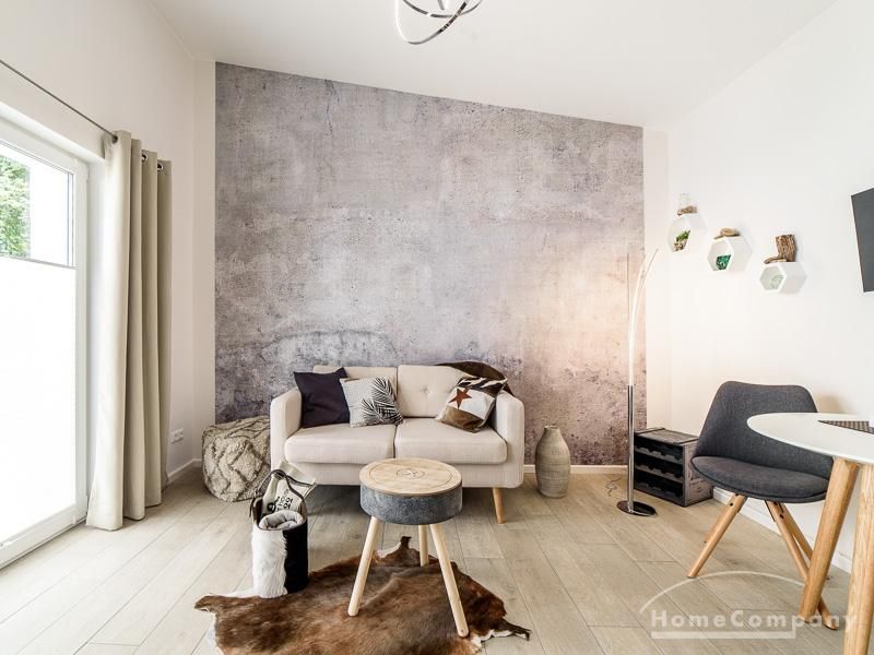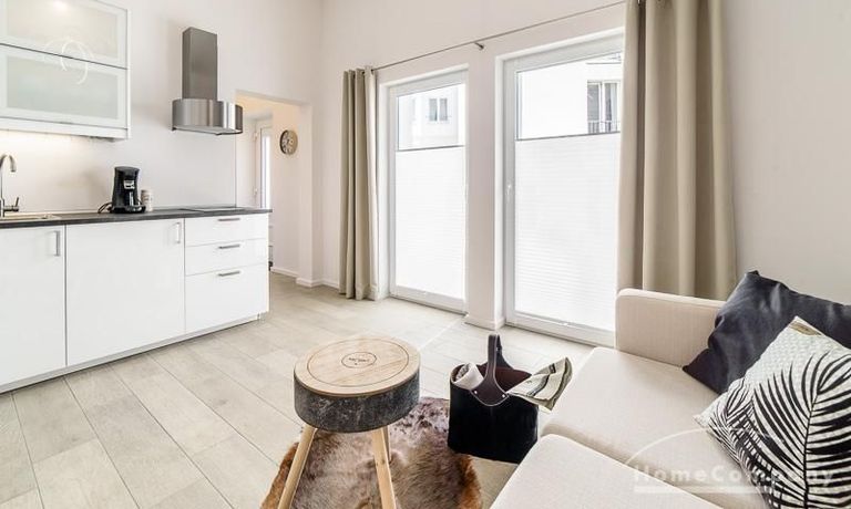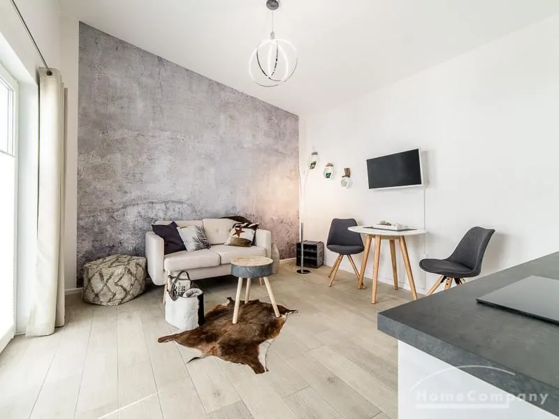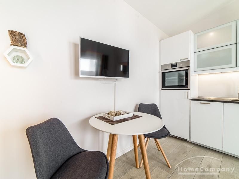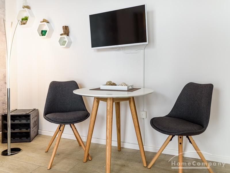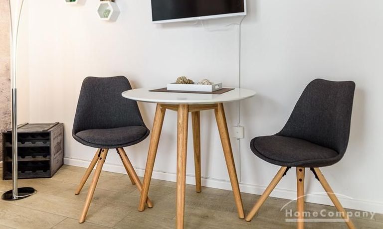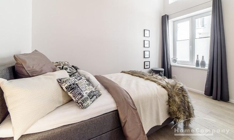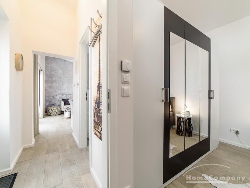 The apartment with floor heating is modern and harmoniously decorated. A bright sofa invites you to relax. A practical side table made of blue cotton, hemp rope and fir wood combines functionality with design and is a real sight. The wall design, the high, oblique ceilings and carefully chosen acceccoires lend the styling a contemporary business ambience. Other contrasting accents, such as the beautiful blessbock fur, an order basket with cozy additional sofa blanket and a fabric pouf complete the overall look. The open high-gloss kitchen is equipped with a washing machine, dishwasher and a Senseo coffee machine. The bright bathroom with underfloor heating, generous shower, scales and hair dryer offers every comfort. The bedroom is equipped with a 1.20m boxspring bed and a 2.70m wardrobe with additional inside drawers. Made-to-measure pleats, which can be adjusted in any position from the top and the bottom, offer a high degree of visibility and sun protection on all windows and provide for gently filtered, natural light in the room. Additional curtains create a pleasant ambience even in the evening hours. The apartment has a terrace and is located in the absolutely quiet inner courtyard of a little busy side street, only 1.2 km from Dammtorbahnhof and the city center.