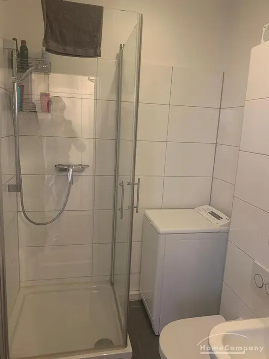 The brightly tiled bathroom has a shower; the washing machine is also located here.