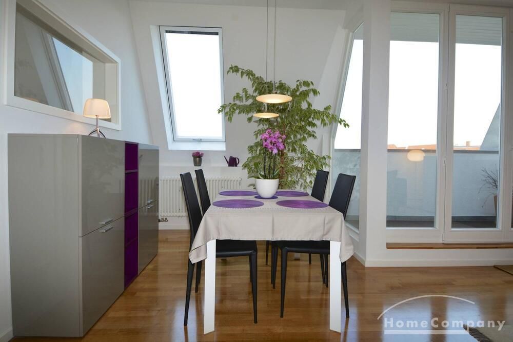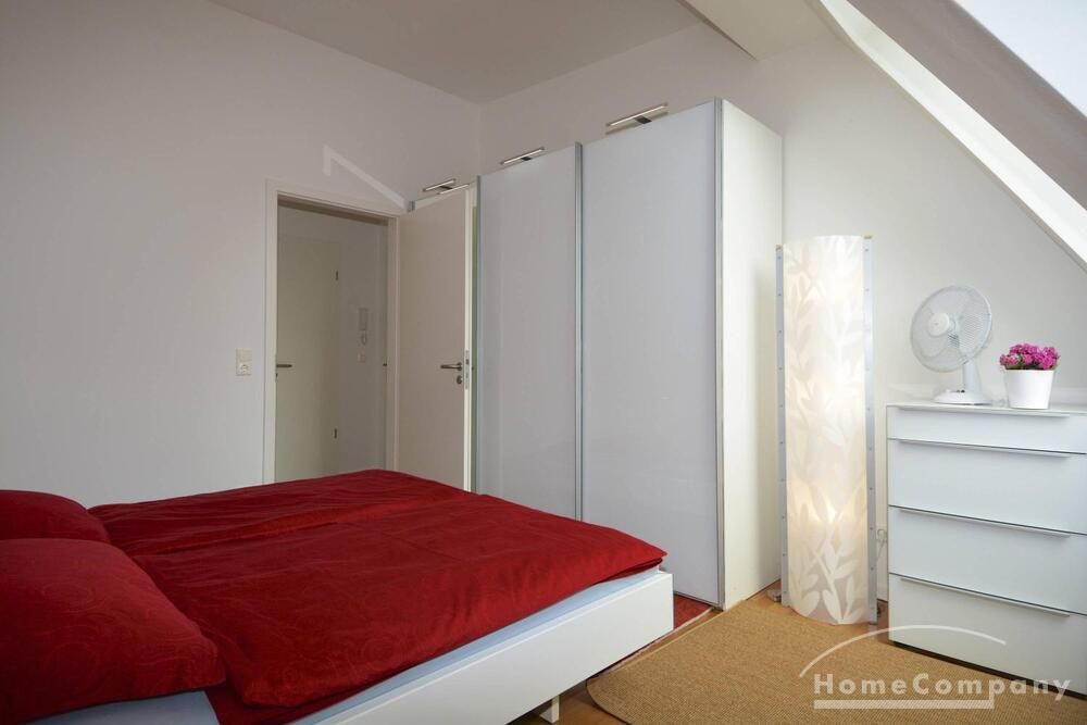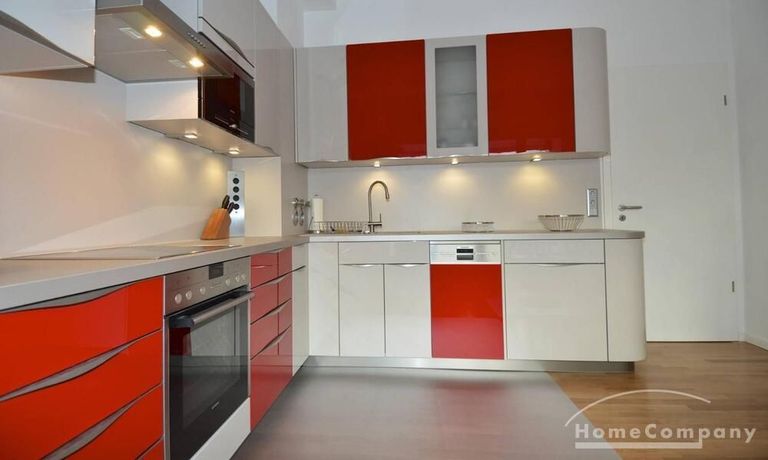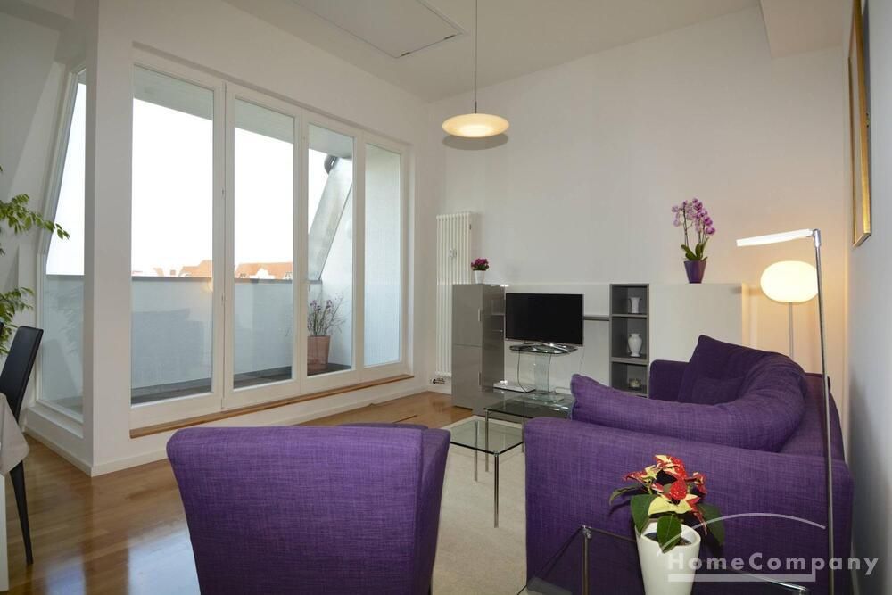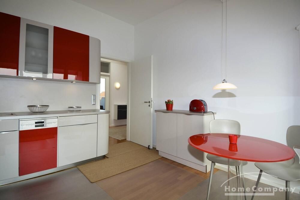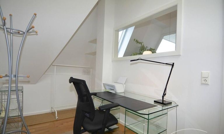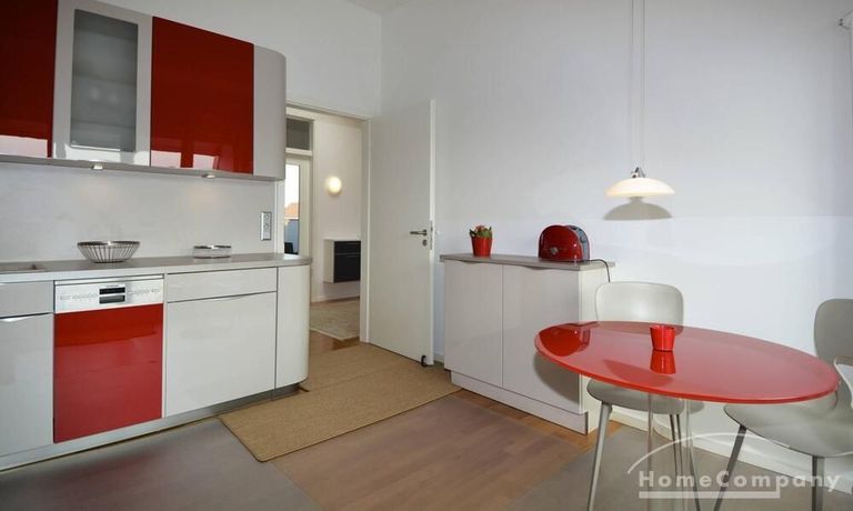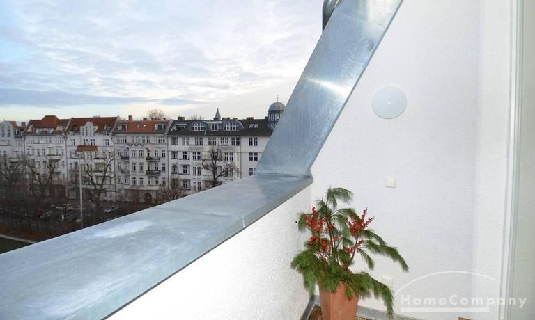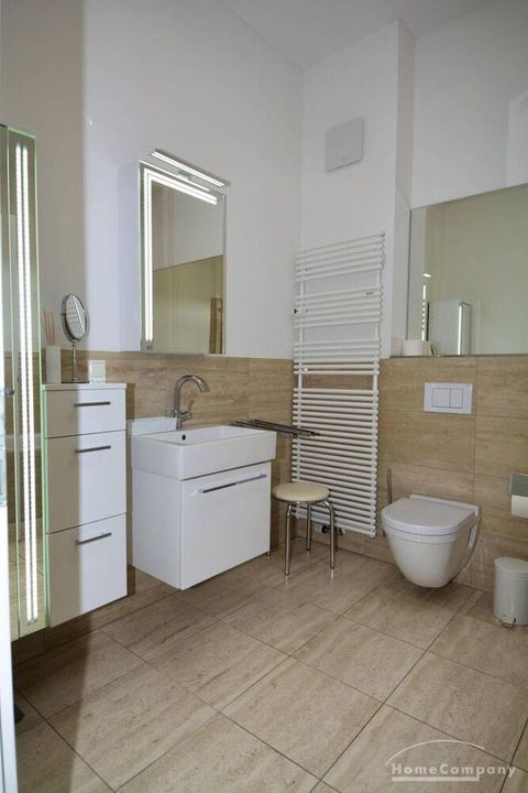 This extraordinarily beautiful premium apartment is situated on the top floor of a refurbished prewar building in the center of Charlottenburg, West-Berlin. It comrises a gorgeous living room with balcony (great view onto the green neighborhood), a bright and comfortable bedroom with a doublebed and wardrobe, and a home office with desk. The modern, classy kitchen is separate and features all kinds of devices (including WMF and Villeroy & Boch), a washing machin, a dishwasher, and it is adjacent to the second balcony that faces South. The spacious bathroom offers a bidet, a bathtube and a separate shower.