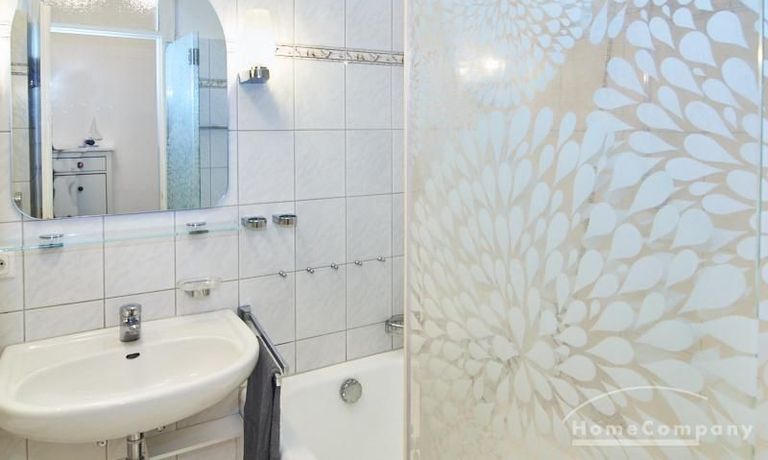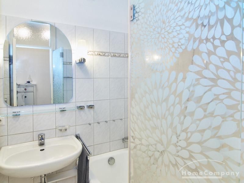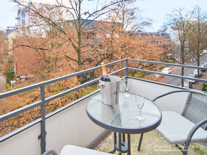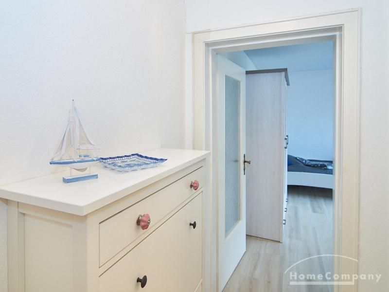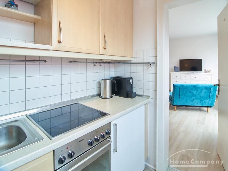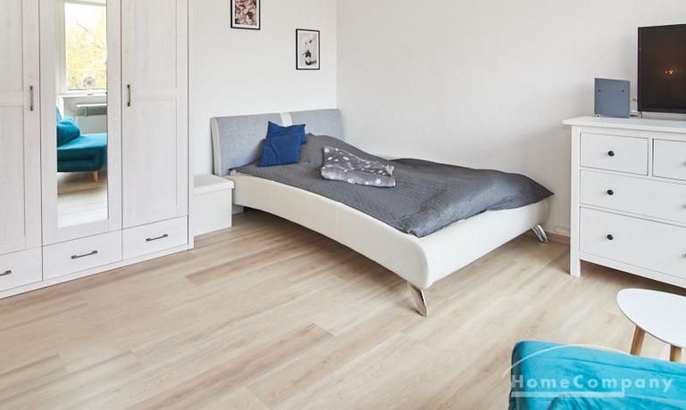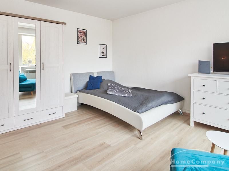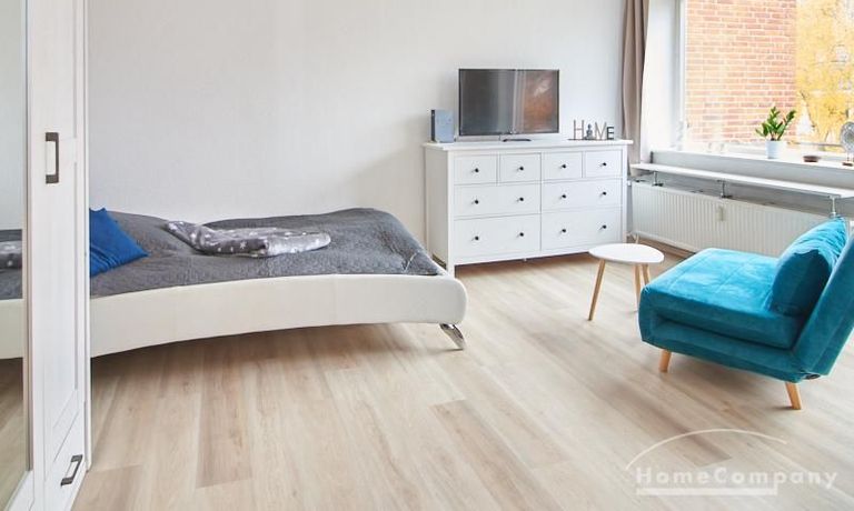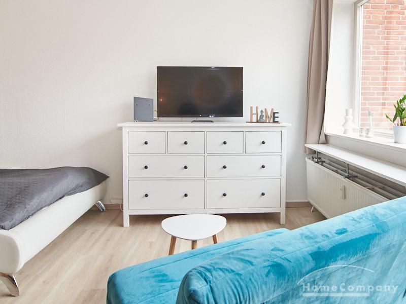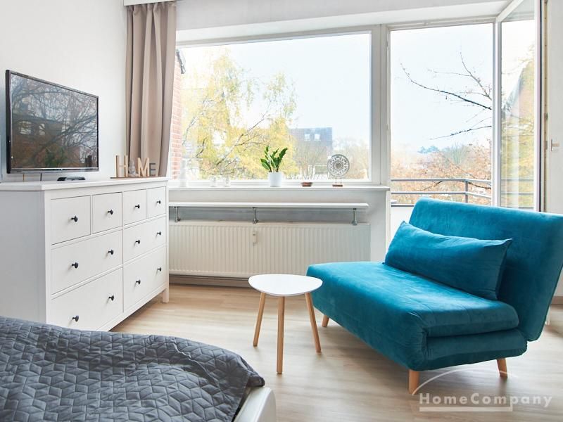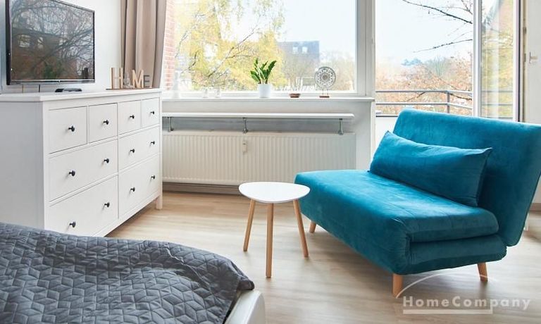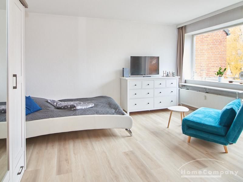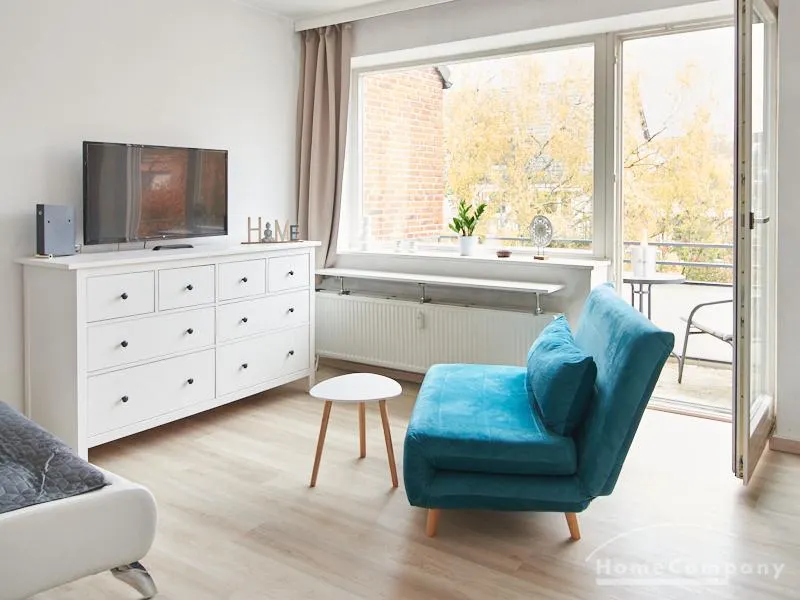 Helle und gut geschnittene 1-Zimmer-Wohnung im 3. Obergeschoss eines sanierten Mehrfamilienhauses in Hamburg-Barmbek, in einer ruhigen Wohnstraße im Komponistenviertel gelegen. Im Wohnraum stehen ein bequemer Sessel, ein TV-Bereich sowie ein Esstisch zur Verfügung, der bei Bedarf auch als Arbeitsplatz genutzt werden kann. Von hier aus gelangt man auf den zum grünen Gartenhof orientierten Balkon.