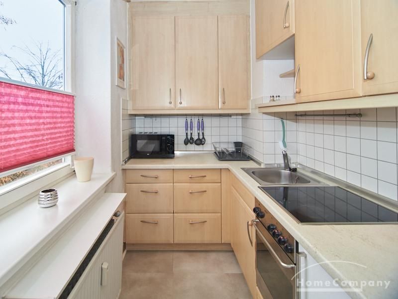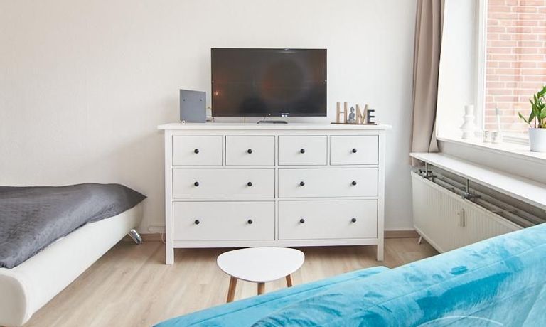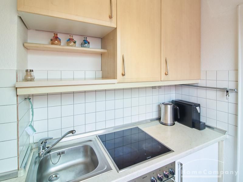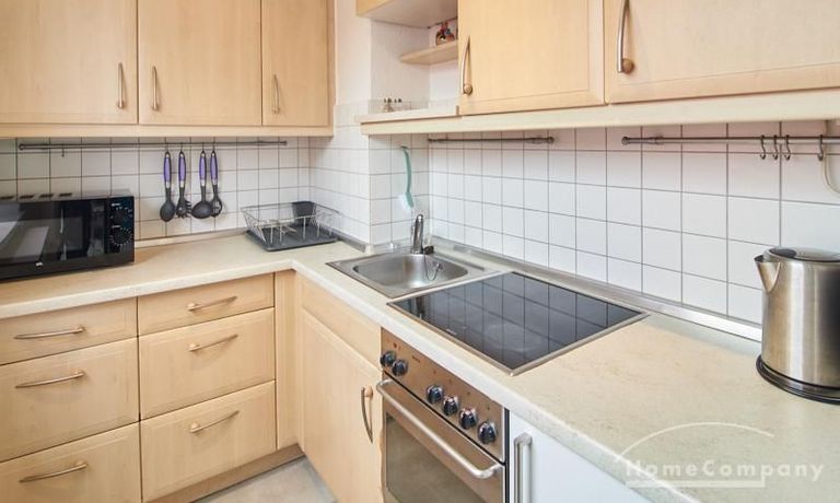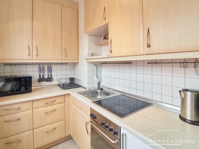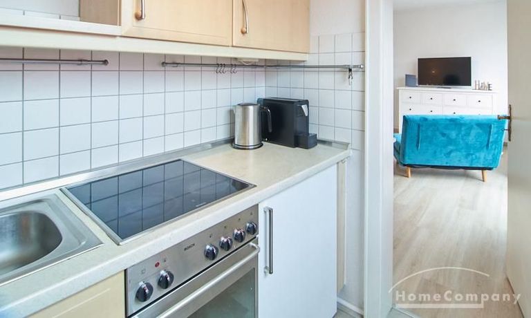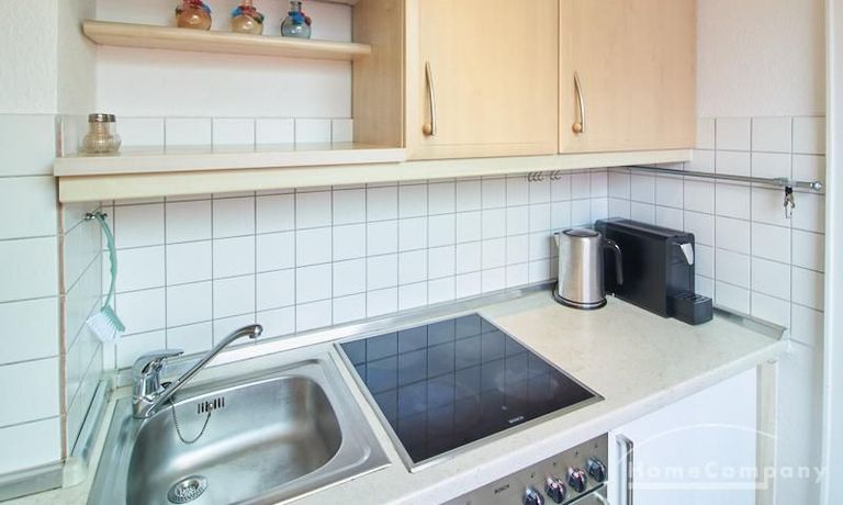Im Schlafbereich steht ein 1,40 m breites Bett sowie ein geräumiger Kleiderschrank. Die separate Küche verfügt über eine moderne Einbauküche mit Herd, Backofen, Kühlschrank und Geschirrspülmaschine. Das Badezimmer ist mit einer Badewanne ausgestattet.