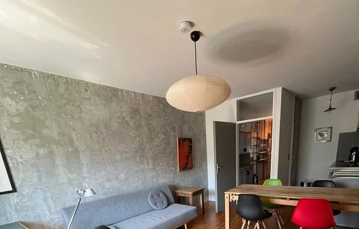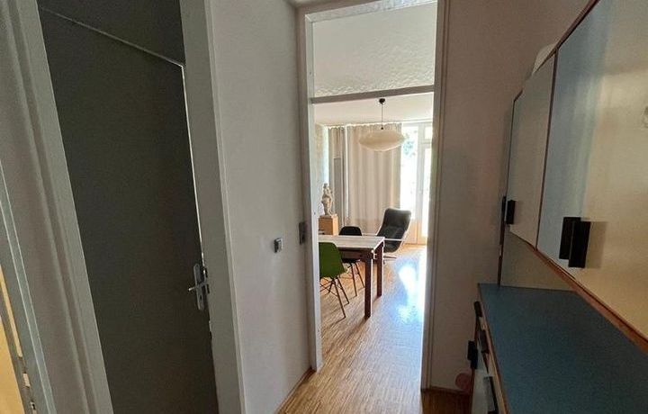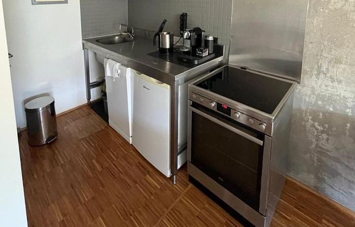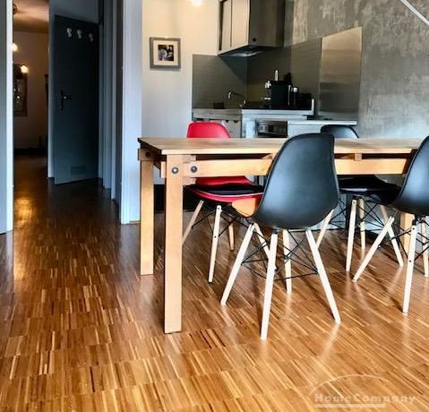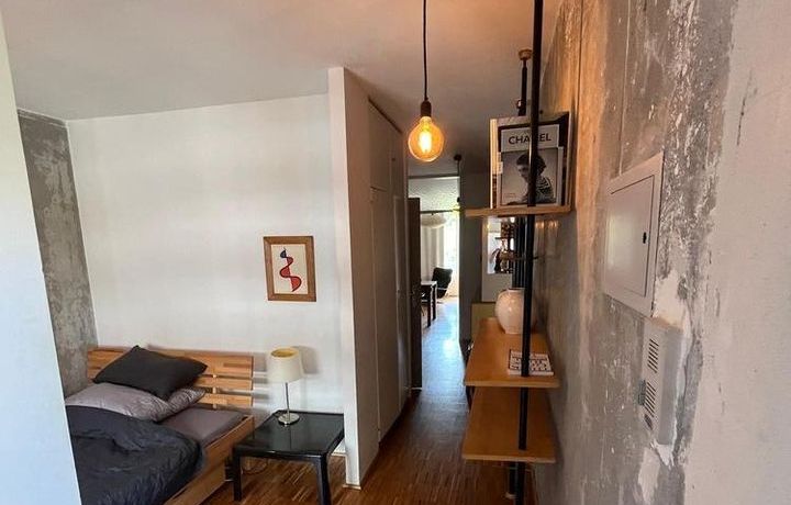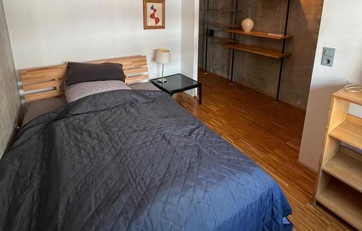 Modern eingerichtetes Wohnzimmer mit Ledercouch, Flatscreen-TV, Arbeits-/ bzw. Esstisch sowie Zugang zur sonnigen Süd-Loggia. Offen gestaltetes Schlafzimmer mit Stapelbett und Bücherregal. Ein Einbauschrank mit großzügigem Stauraum befindet sich im Flur. Vollständig eingerichtete Edelstahl-/Industrieküche im Wohnzimmer integriert mit vollwertigem Herd (nicht auf den Fotos zu sehen), Kühlschrank, Spülmaschine und Allem für den täglichen Bedarf.