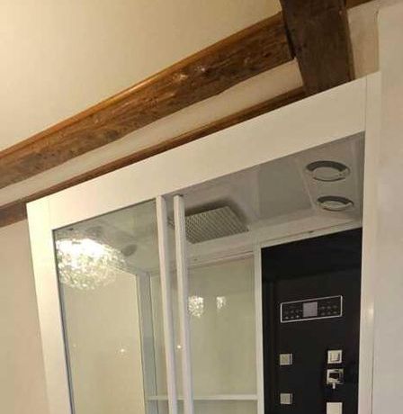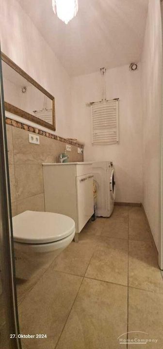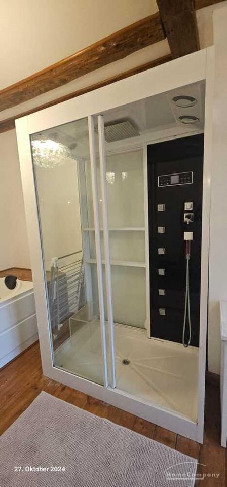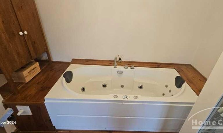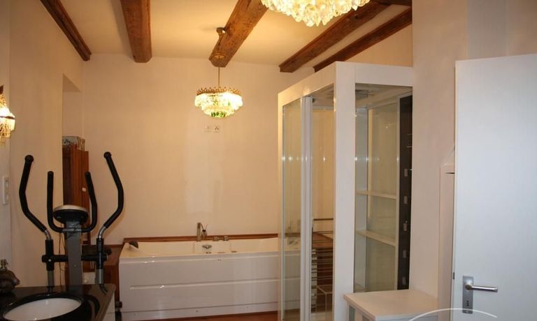 1 Bad mit Dusche und gr. Wanne mit Wirlpool (Jakuzi), Dampfbad und Sportgeräten. 1 Bad mit Dusche (und Waschmaschine; ohne Fenster); 1 Gäste-WC.