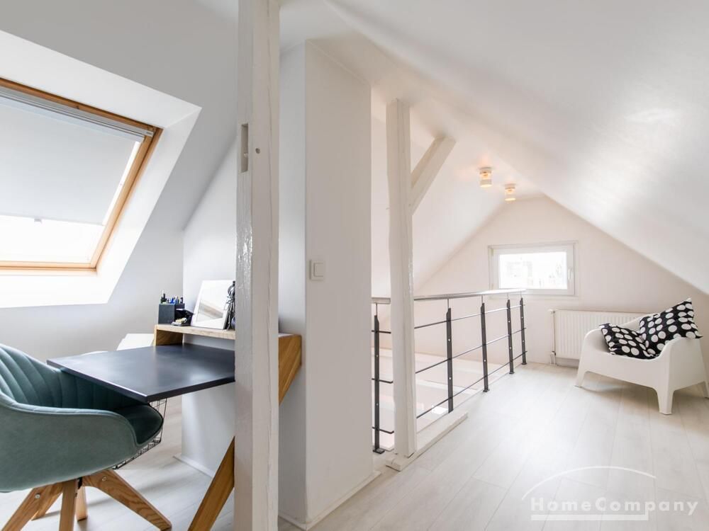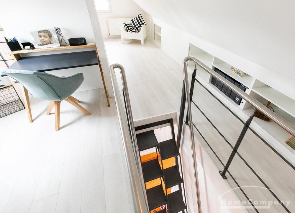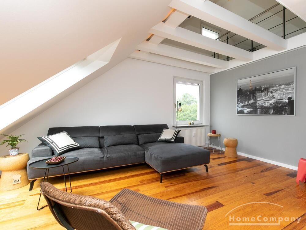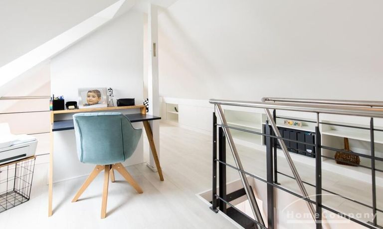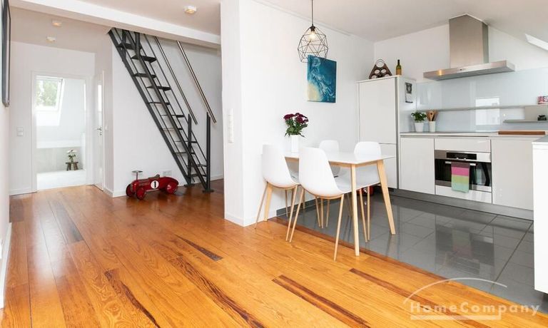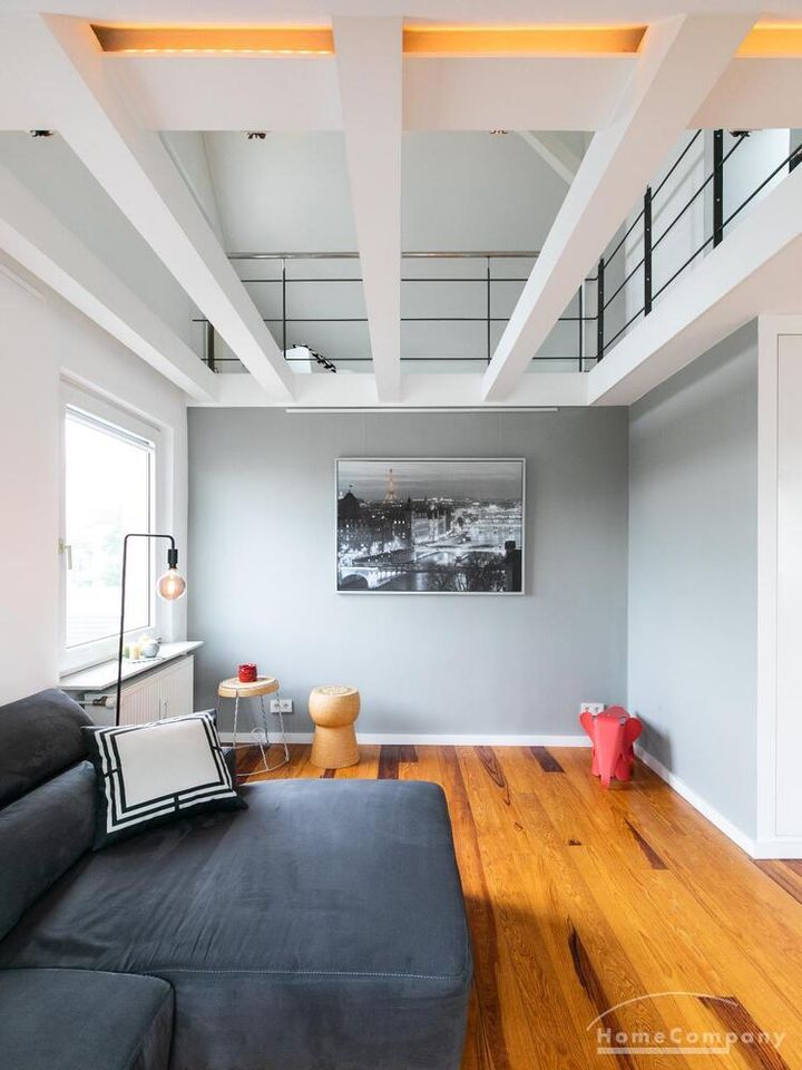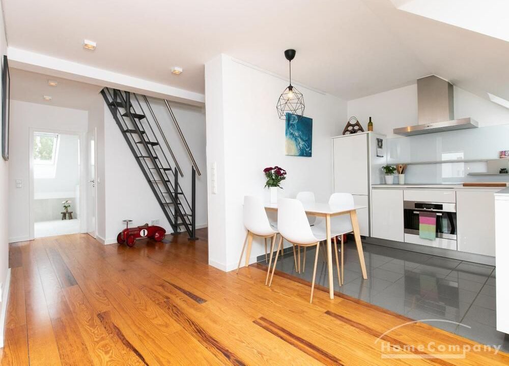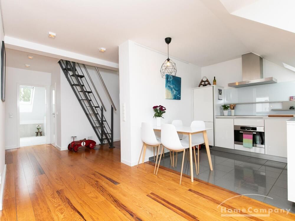 Sehr schöne, helle Wohnung über zwei Ebenen in zentraler Lage in einem in zweiter Reihe sehr ruhig gelegenen Mehrfamilienhaus. Die Wohnung wurde im Jahr 1999 grundlegend modernisiert. Das Wohnzimmer mit Balkon in West-Ausrichtung öffnet sich zur Galerie. Hier befindet sich ein kleiner Arbeitsbereich. Die moderne Einbauküche ist zum Wohnzimmer hin offen. Ein Essbereich für 4 Personen steht zur Verfügung. Das moderne Duschbad ist in hellen Grau/Beigetönen gehalten.