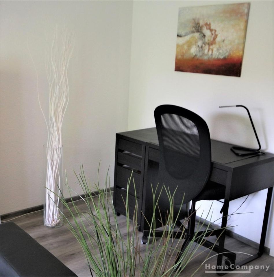 + Wohnzimmer mit Sofa, Schreibtisch mit Stuhl, TV, Regal, Esstisch mit 2 Stühlen;