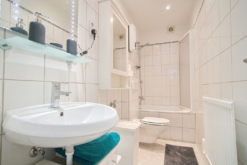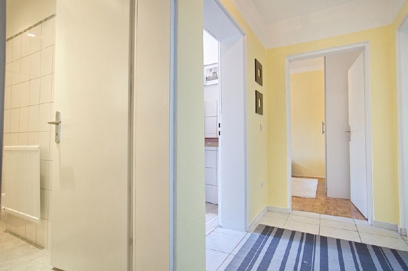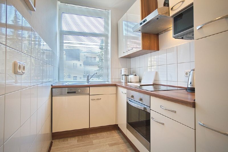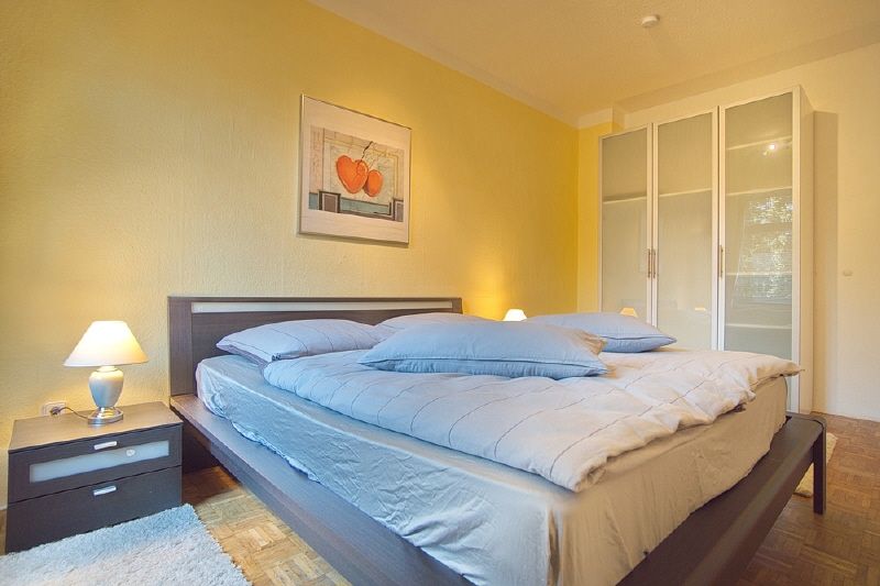 Komplette Möblierung und Ausstattung, zwei Schlafzimmer, Parkettboden. Wohnraum mit Sofa, Smart-TV, Essbereich für 3 oder 4 Personen. Die Küche befindet sich in einem separaten Raum und ist mit einer Einbauküche ausgestattet, inkl. Spülmaschine, Ceranherd/Dunstabzug, Kühlschrank mit Gefrierfach, Microwelle und Kaffeemaschine, Geschirr etc. steht bereit. Ein Schlafzimmer mit Doppelbett, Kommode und Kleiderschrank, ein weiteres mit Einzelbett, Kommode und Kleiderschrank. Ein sehr schönes, helles Badezimmer gehört zur Wohnung. Internetnutzung ist über W-LAN möglich. Waschmaschinen und Trockner können im Haus genutzt werden.
