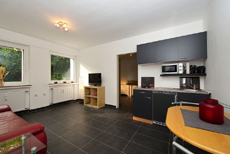 Moderne und komplette Ausstattung, Fliesenoden, Rolläden. Ein reizvoller kleiner Terrassenplatz mit Blick in den Garten steht zur Nutzung zur Verfügung. Wohnraum mit Sofa, Flachbild-TV mit digitalem Sat-Empfang, offen integrierte Single-Einbauküche und Essplatz mit zwei Stühlen, Geschirr, Kaffeemaschine etc. sind vorhanden. Das separate Schlafzimmer ist mit zwei Betten und großem Kleiderschrank eingerichtet. Das Duschbad ist modern und geschmackvoll gestaltet. Auf Wunsch kann ein Leihfahrrad zur Verfügung gestellt werden.
