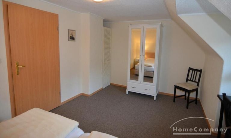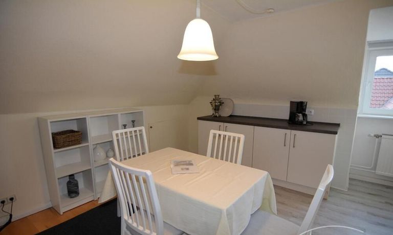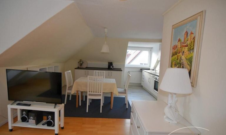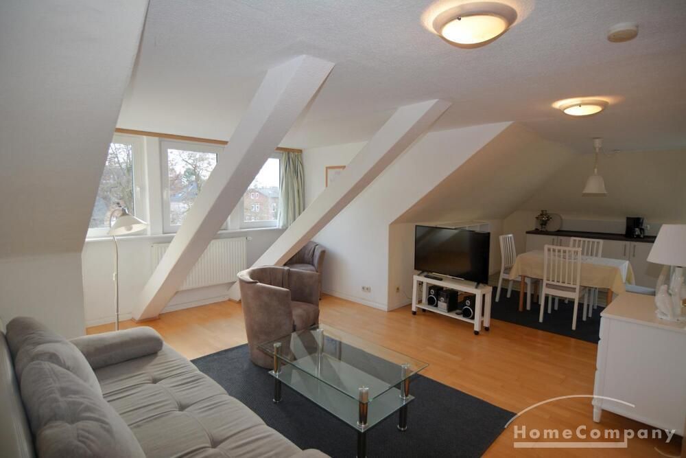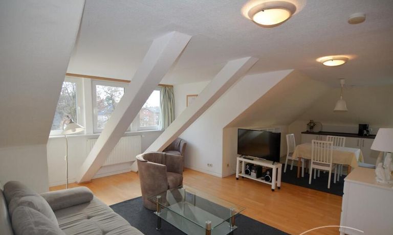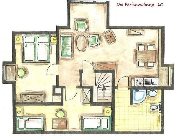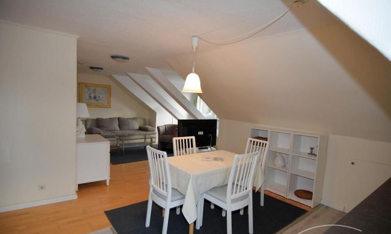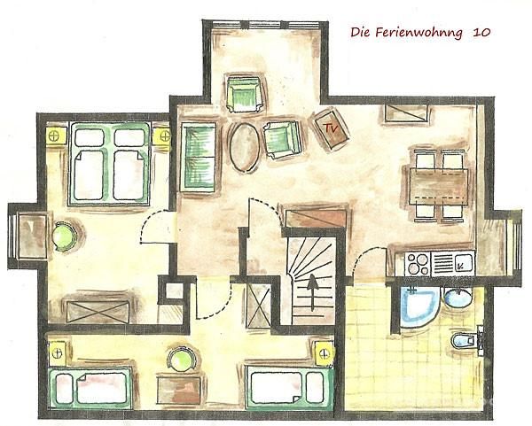 Die ca. 56m² große 3-Zimmerwohnung befindet sich im gesamten Dachgeschoß. Ein Schlafraum verfügt über zwei bequeme Boxspringbetten mit verstellbaren Kopfteil (je 90 x 200), der andere über 2 Einzelbetten (90 x 200). Die Küchenzeile im Wohn-/Eßbereich verfügt über Spüle, Umluft-Herd mit Cerankochfeld, Mikrowelle, Kühlschrank mit Gefrierfach und einen Geschirrspüler.