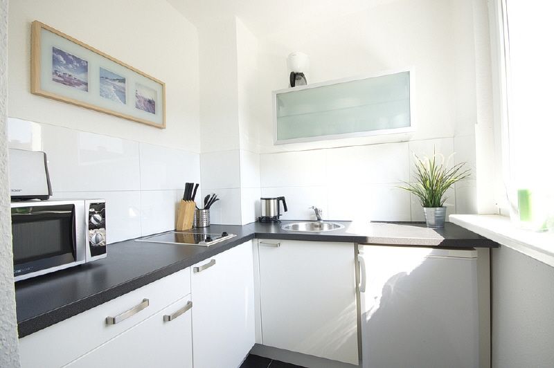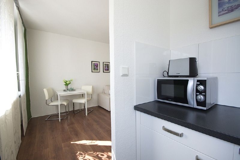 Moderne, ansprechende Gestaltung, Laminatboden. Wohnraum mit Essbereich, Sofa, Flachbild-TV mit DVB-T-Empfang. Der Kochbereich ist vom Wohnraum aus begehbar und beinhaltet ein Doppelkochfeld, Microwelle, Kühlschrank, Kaffeemaschine und Geschirr. Das Schlafzimmer ist mit einem Bett (1,40 x 2 m) und einem Schwebetüren-Kleiderschrank eingerichtet. Weißes, neu gefliestes Wannenbad mit Duscharmatur, WC wandhängend, Handtuchheizung. Eingangsbereich mit Garderobe. Eine Grundausstattung an Handtüchern und Bettwäsche steht zur Verfügung. Die Nutzung eines W-Lan-Internetzugangs kann vereinbart werden.