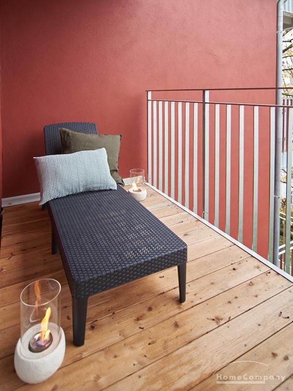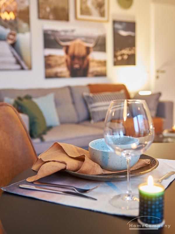 Der wunderschöne Blick in den ruhigen, grünen Innenhof macht den besonderen Charme des Apartments aus. Dies wird durch das Design der Inneneinrichtung aufgegriffen und betont. Zielgerichtete Auswahl der Möblierung erschließt den hohen Freizeitwert des Balkons. Das Murphy Schrankbett ist 120x200cm groß. Dem Langzeitaspekt der Instandhaltung wird durch pflegeleichte Materialien Rechnung getragen. So kann nach einem langen, anstrengenden Arbeitstag der Feierabend im Grünen beim flackernden Schein des Ethanol- Tischfeuers für den nötigen Ausgleich gesorgt und die karrierewirksame Entspannung genossen werden. Natürliche Materialien, wie Holz, Leinen und Leder bestimmen das Konzept „Soft Nature“. Eine Bildergalerie thematisiert ruhige, ursprüngliche Naturmotive: Highlandrind, schroffe Bergmotive, frischer, kühler Tannenwald. Ein Lampenschirm aus Kiefernholz, in Form eines Tannenzapfens greift die Bilderwelt dreidimensional auf. Erd- Grün-, und Blautöne sorgen für ein entspanntes Wohngefühl und finden eine Entsprechung in den Accessoires. Im Wohnbereich, in der Küche und im Flur bieten Holzdielen in Eiche astig gebürstet geölt eine ansprechend moderne Wohnatmosphäre. Der Fußboden im Bad ist mit eleganten dunkelgrauen Feinsteinzeugfliesen, die Wände im Duschbereich mit hellgrauen Feinsteinzeugfliesen ausgestattet. Waschtisch und WC sind von Keramag und weiß.