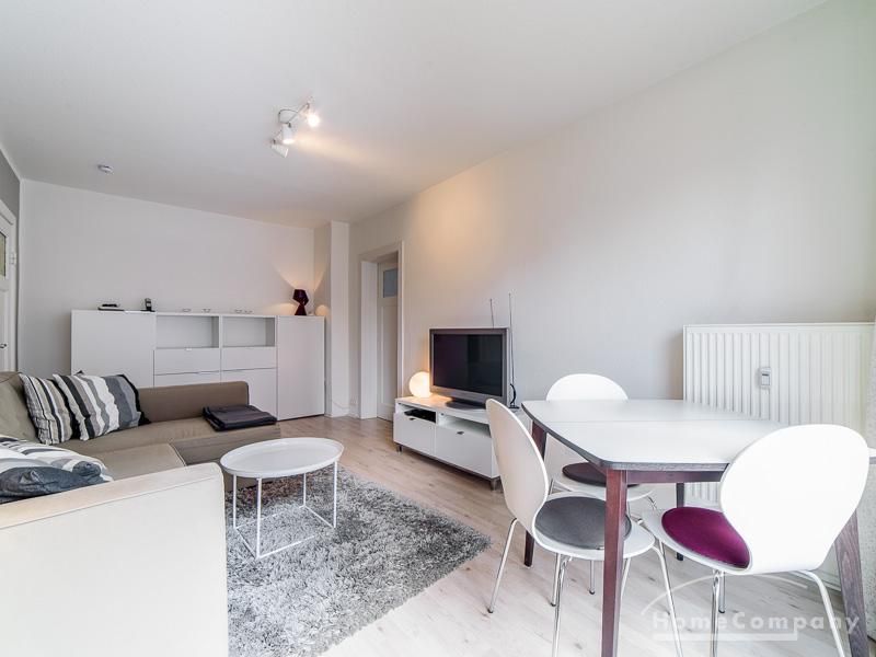 Apartment mit Wohnzimmer und kleine, separtem Schlafzimmer und Balkon. Die Küche ist sehr funktional mit Waschmaschine, Spülmaschine, Kühlschrank und Herd ausgestattet und grenzt direkt an das Wohnzimmer. Das Duschbad ist weiß gefliest. Der Einbauschrank im Schlafzimmer bietet genügend Stauraum.