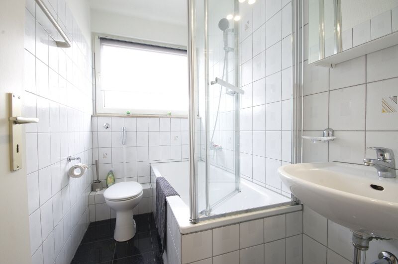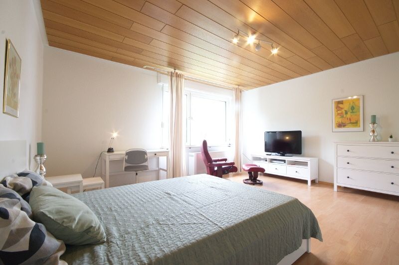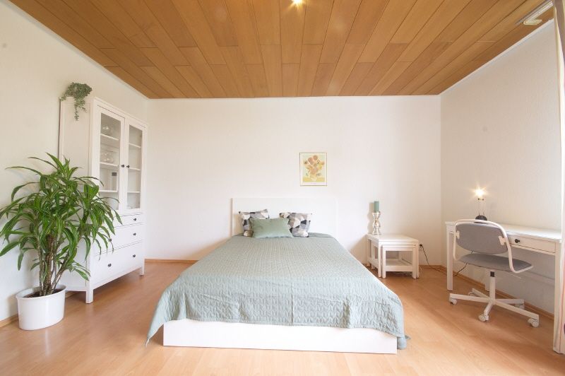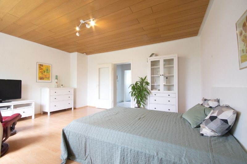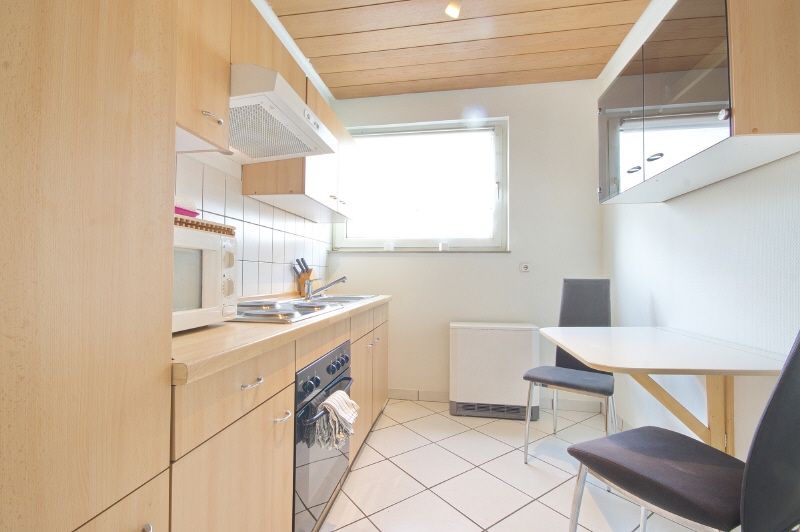 Moderne und gute Ausstattung. Ruhiger Wohnschlafraum mit Gartenblick, Laminatboden, 1,40 großem Bett, neues Sideboard, digitales Antennenfernsehen. Diele gefliest und mit Garderobe und Kleiderschrank ausgestattet. Weiß gefliestes Duschbad mit Fenster. Separate Küche mit Einbauküche und kleinem Klapptisch. Küchenequipment wird gestellt. Regelmäßige Reinigung kann auf Anfrage gebucht werden. Waschmaschine und Trockner sind für die Mieter im Keller zur freien Nutzung vorhanden.