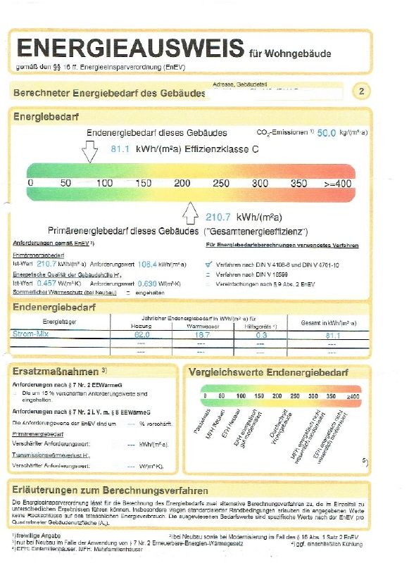 Angaben zum Energieausweis: Baujahr des Hauses: 1963, Wärmeerzeuger 1995, Energiebedarfsausweis Wert: 81,1 kWh/(m²a), Energieträger: Strom-Mix.