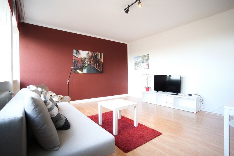 Fully furnished and equipped, with colour-coordinated interior design. High speed internet connection provided. The living room is furnished with a sofa with sofabed function, an armchair, a low display cabinet with TV plus a dining table and chairs. The separate fitted kitchen is equipped with a ceramic hob and large fridge. The bedroom features a double bed with high quality mattresses, as well as a spacious wardrobe. Guest room with single bed, desk and wardrobe. Compact bathroom with light-coloured tiles, offering a bath with shower attachment. You also have use of a communal washing machine and dryer in the building.