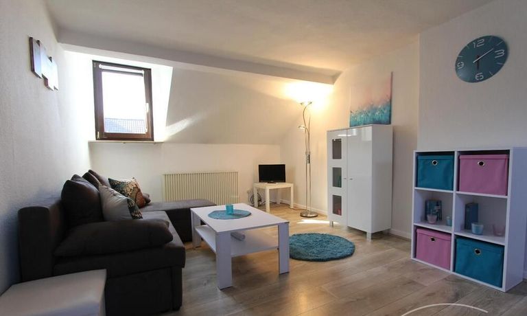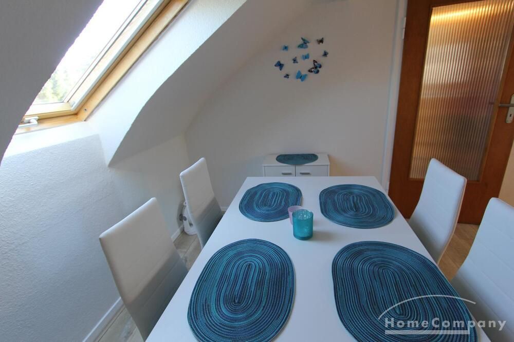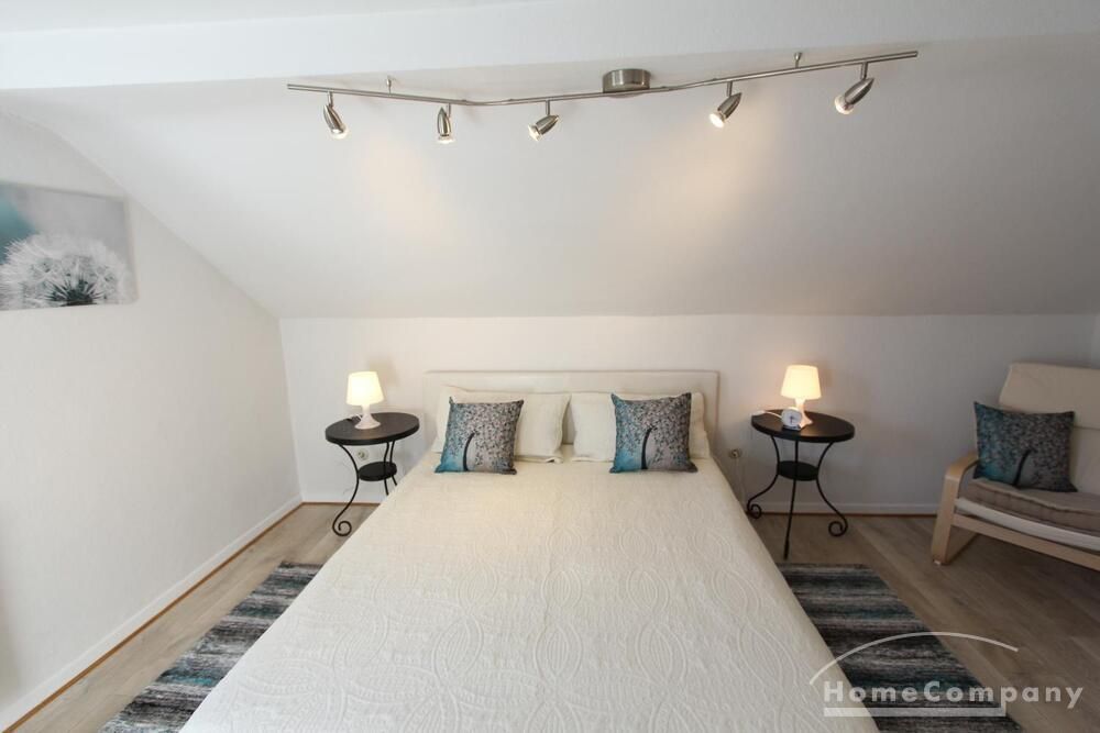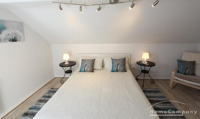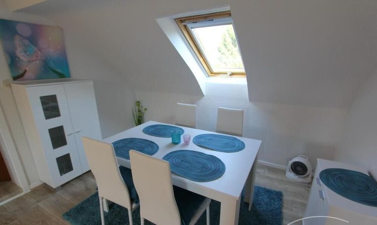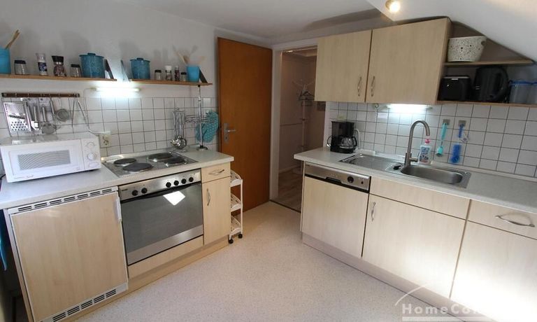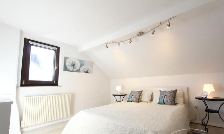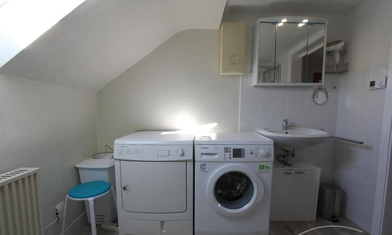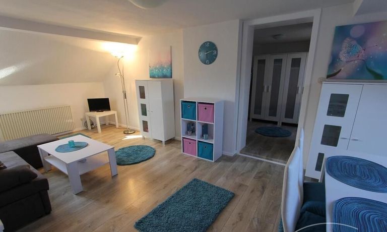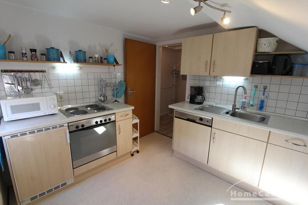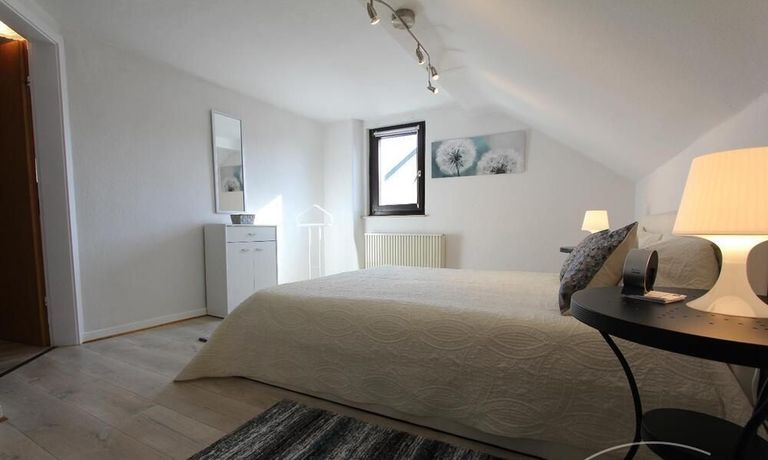 Die helle Dachgeschoss-Wohnung besteht aus einem Wohnzimmer mit gemütlichen Sitzgelegenheiten und einem Esstisch für 4 Personen, einem Schlafzimmer mit 160er Bett (unter dem Bett befinden sich große Bettkästen), einer voll ausgestatteten Einbauküche u. a. mit Spülmaschine, Toaster, Eierkocher, elektrischer Saftpresse, einem kleinem Bürozimmer mit Schreibtisch, dem Eingangsbereich mit ausreichend Staufläche durch zwei Schränke und einem weiß gefliesten Tageslichtduschbad mit Waschmaschine und Trockner.