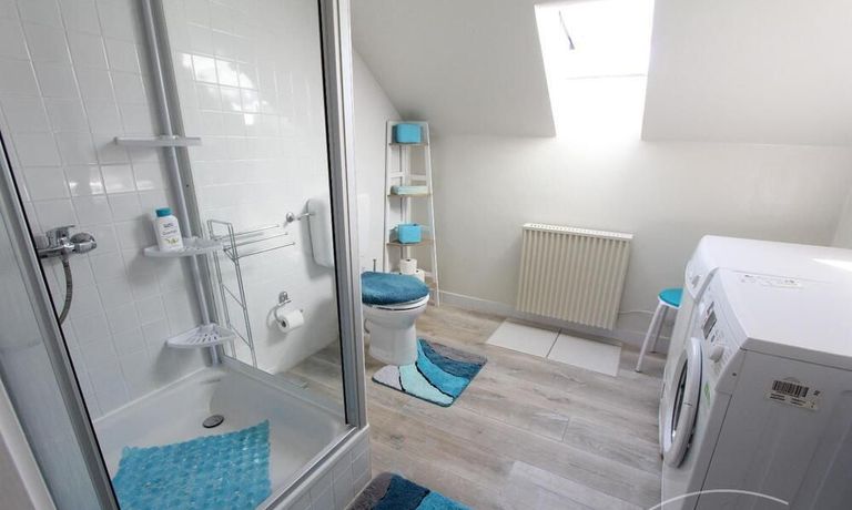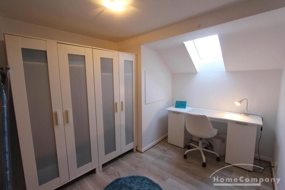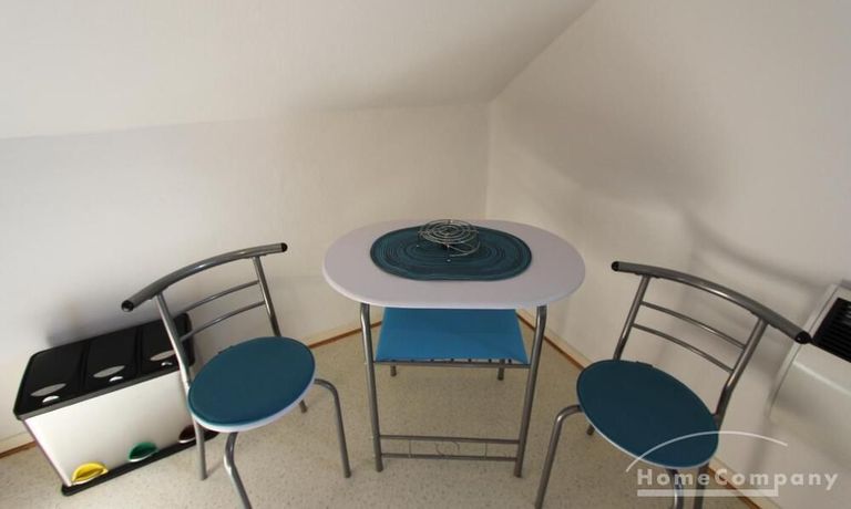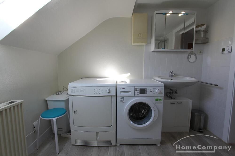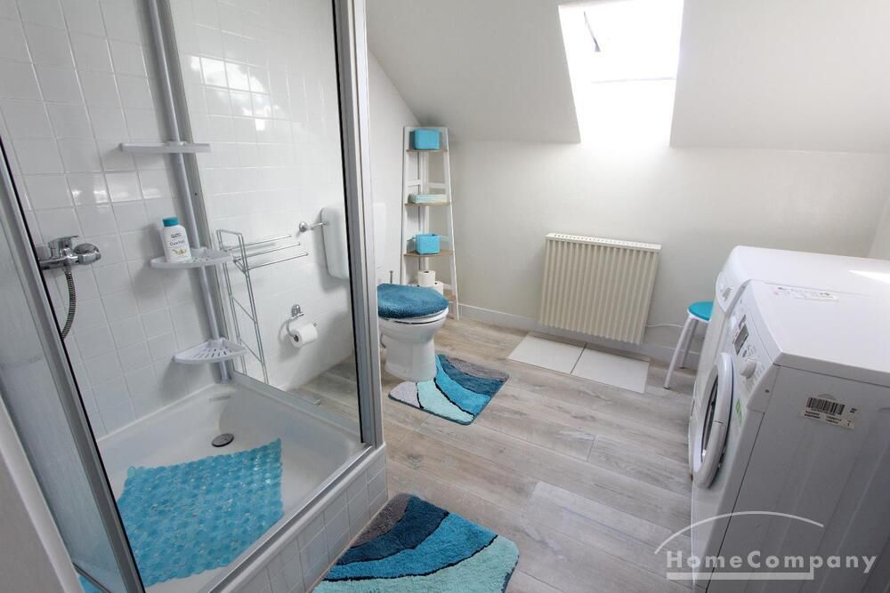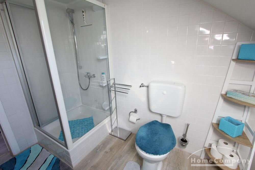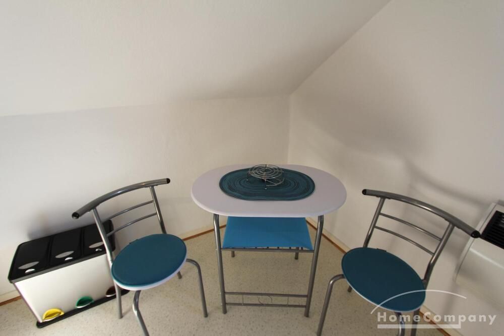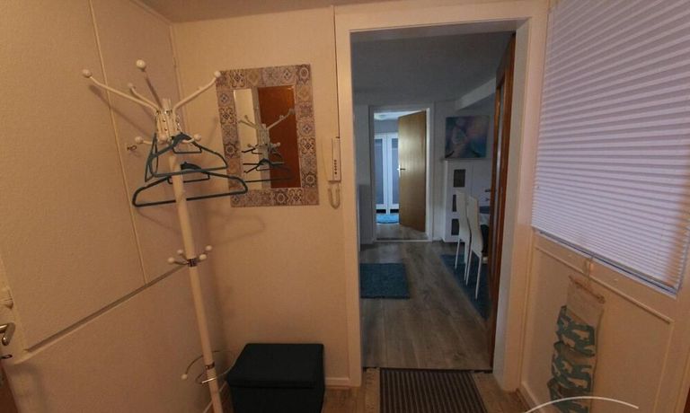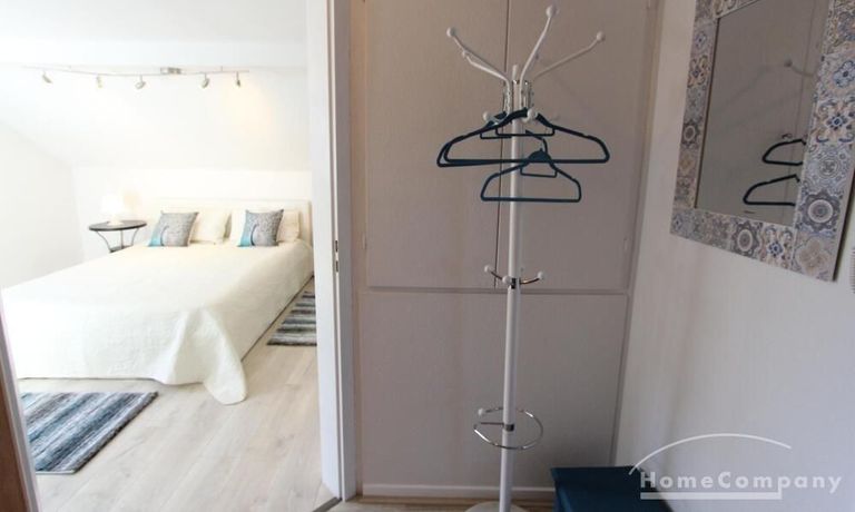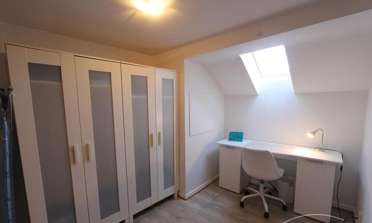 Die helle Dachgeschoss-Wohnung besteht aus einem Wohnzimmer mit gemütlichen Sitzgelegenheiten und einem Esstisch für 4 Personen, einem Schlafzimmer mit 160er Bett (unter dem Bett befinden sich große Bettkästen), einer voll ausgestatteten Einbauküche u. a. mit Spülmaschine, Toaster, Eierkocher, elektrischer Saftpresse, einem kleinem Bürozimmer mit Schreibtisch, dem Eingangsbereich mit ausreichend Staufläche durch zwei Schränke und einem weiß gefliesten Tageslichtduschbad mit Waschmaschine und Trockner.