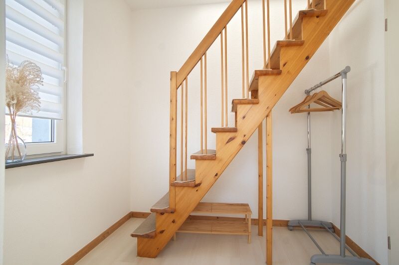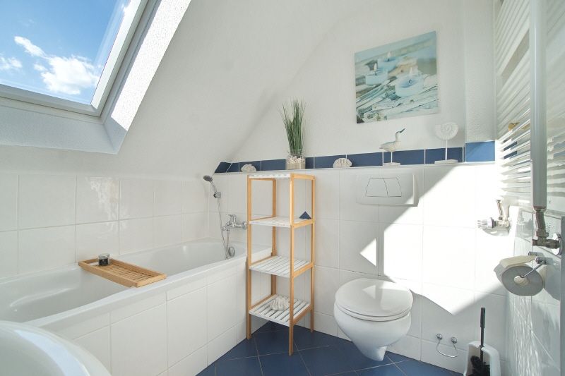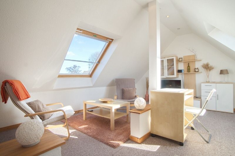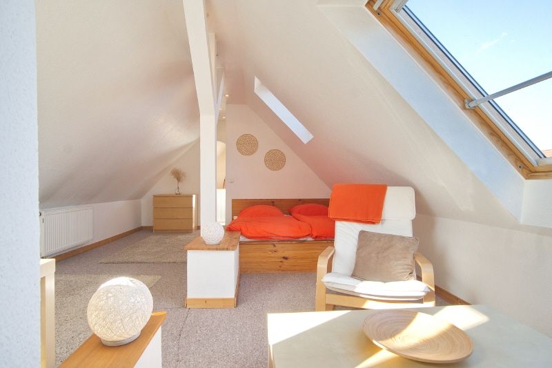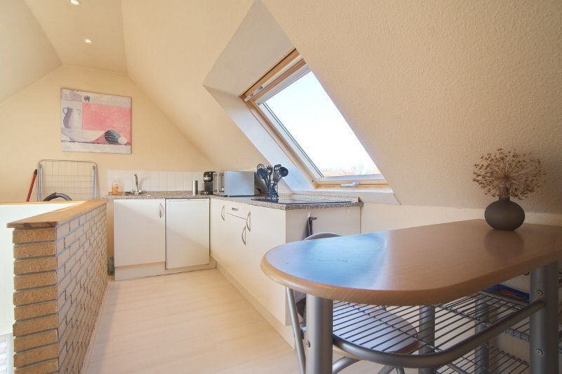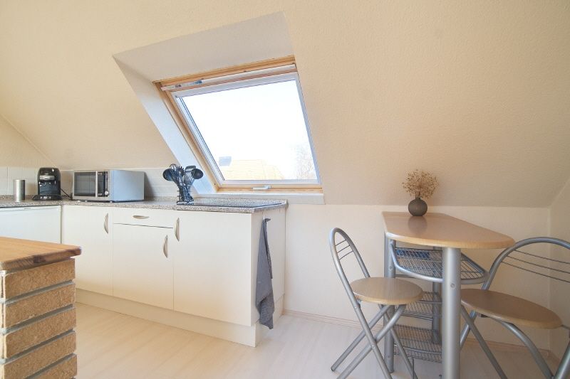 Der wohnliche Wohnschlafraum ist mit einem Doppelbett, Sitzecke, TV-Gerät (DVB) und einem Arbeitsplatz ausgestattet. Die etwas separat liegende Küche verfügt über einen Herd, Mikrowelle, Kühlschrank mit Eisfach sowie Geschirr, Besteck etc. Ein hell gefliestes, kleines Bad (Wanne unter der Schräge) mit Fenster steht zur Verfügung. Die Bettwäsche wird gestellt und ein Reinigungsservice kann gegen Aufpreis organisiert werden.