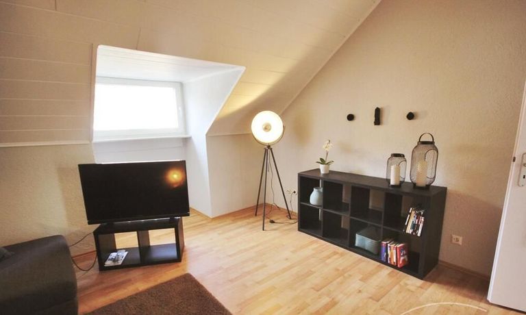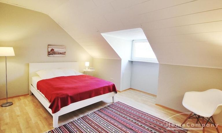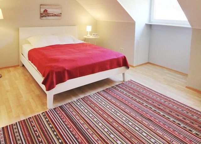 Im Schlafzimmer steht ein Doppelbett zur Verfügung. Die leichten Schrägen vermitteln ein gemütliches Wohnambiente