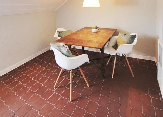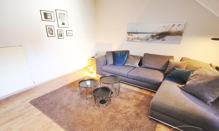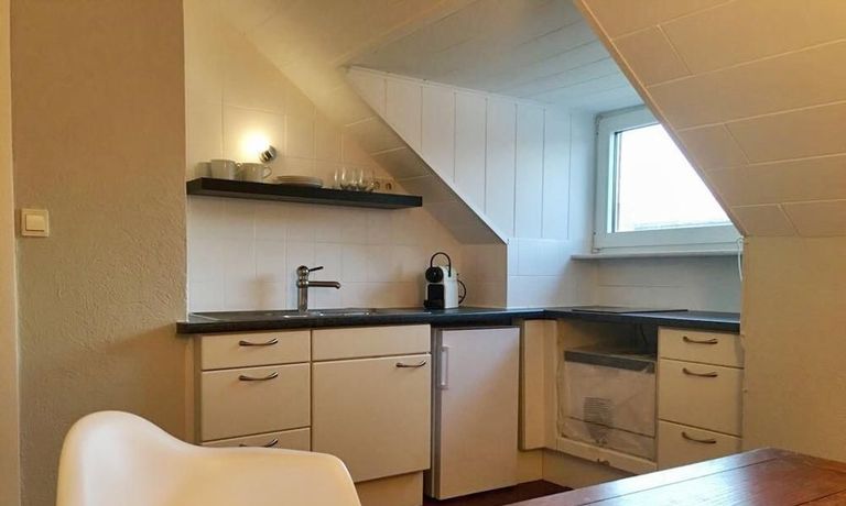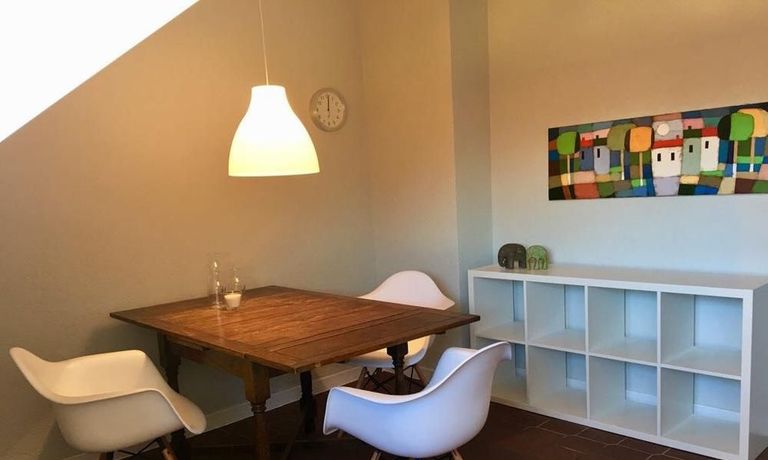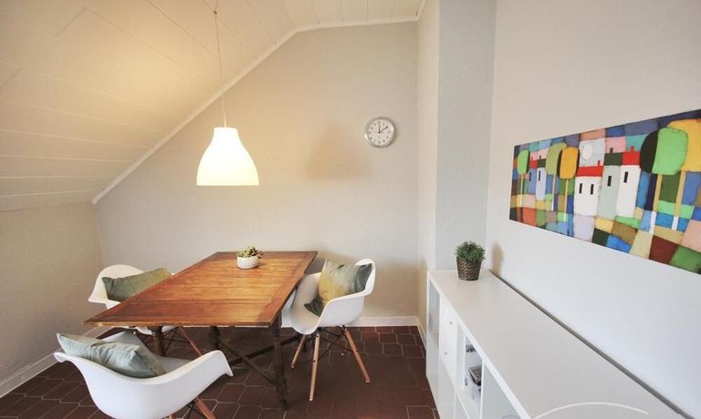 Die Wohnung ist geschmackvoll und gemütlich möbliert. Direkt neben der offenen und vollständig ausgestatteten Küche lädt ein gemütlicher Esstisch zum Bewirten von Gästen ein.