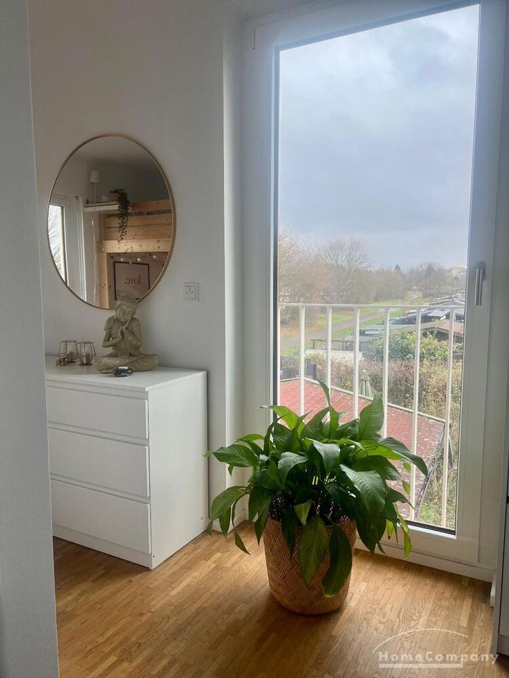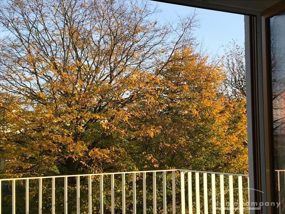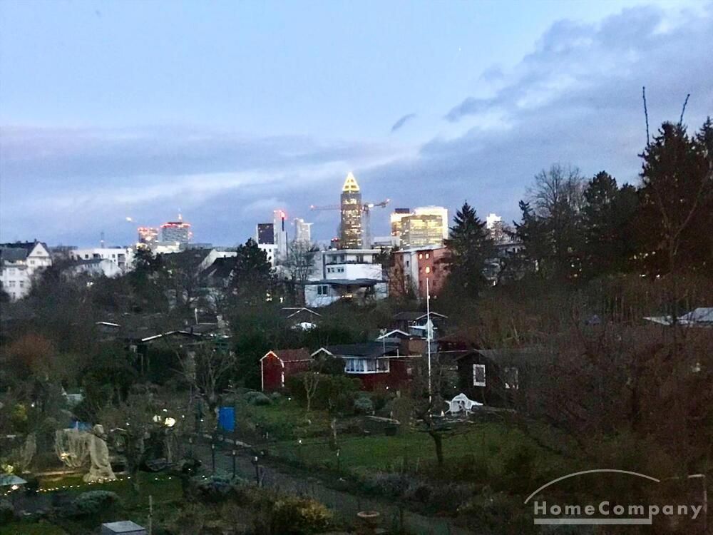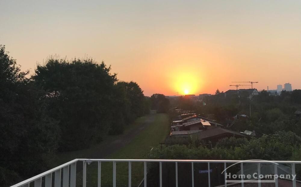 Balkon: Großer Balkon mit Blick auf Schrebergärten und Skyline
