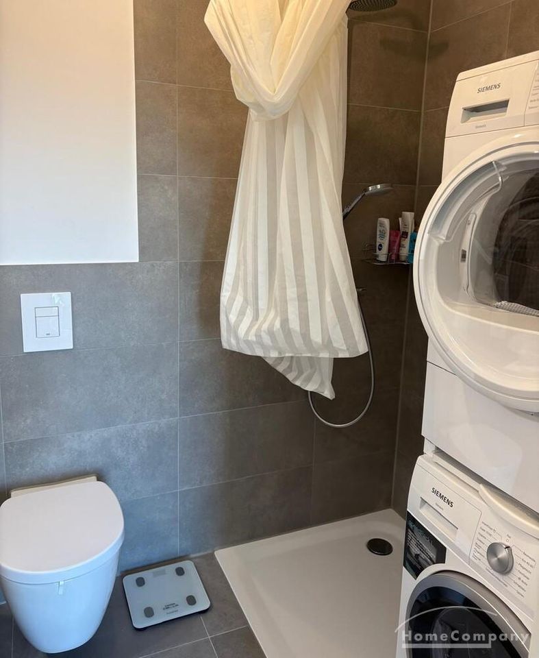 Bad: Modernes Duschbad mit Waschmaschine und Trockner