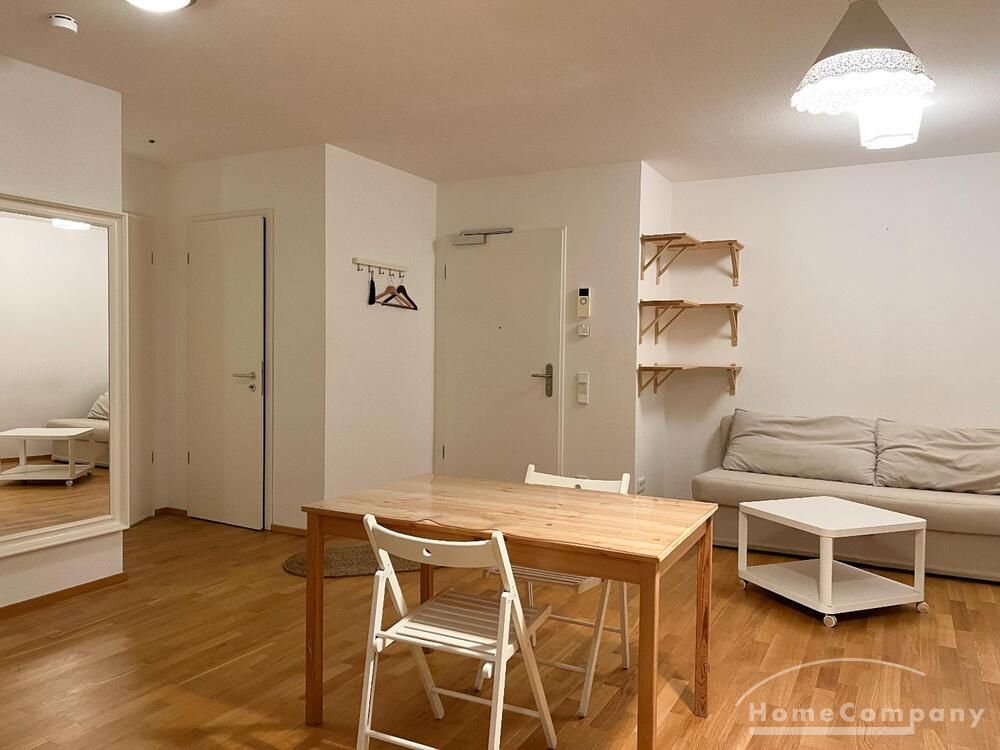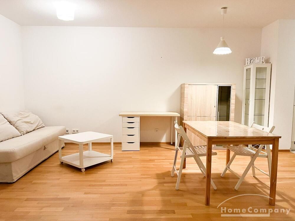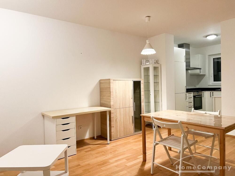 Wohnen: Wohnbereich mit Zugang zum Balkon und zur offenen Küche.