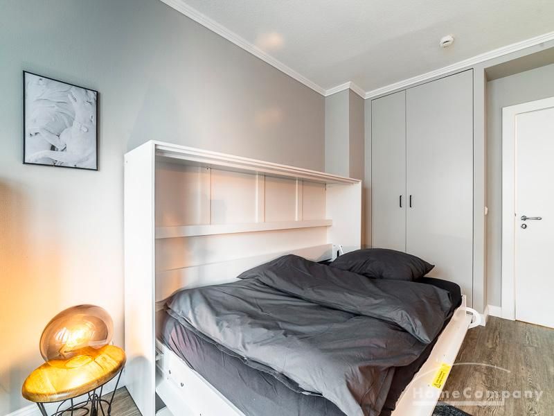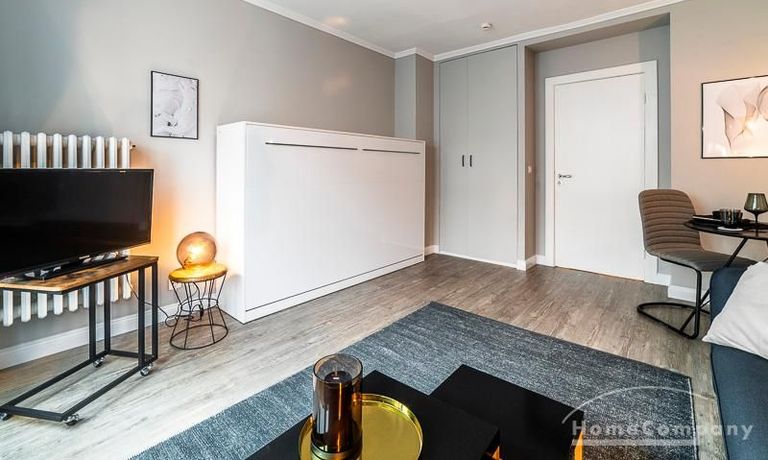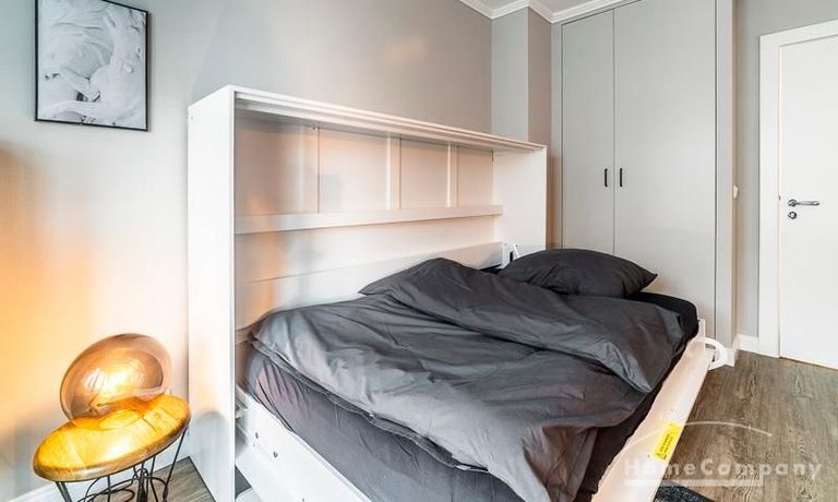 in Ess-, Wohn- und Schlafbereich aufgeteilt, wodurch das Apartment an Platz und Ordnung gewinnt. Das zeitlose Schrankbett integriert sich perfekt in die elegante, stylische Einrichtung, kann tagsüber mühelos hochgestellt werden und bietet somit die optimale platzsparende Lösung.