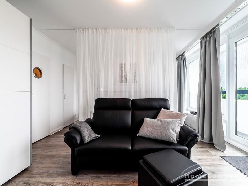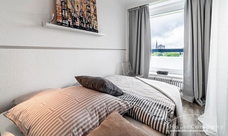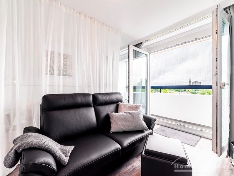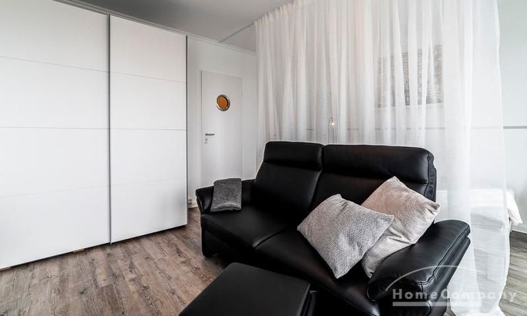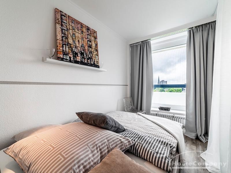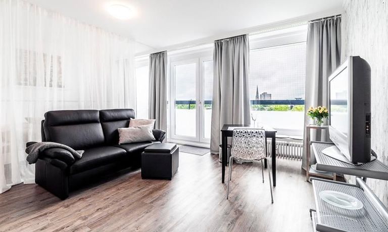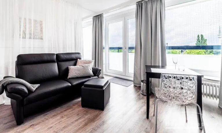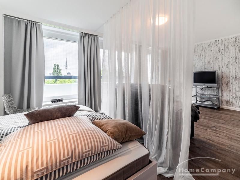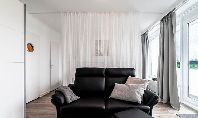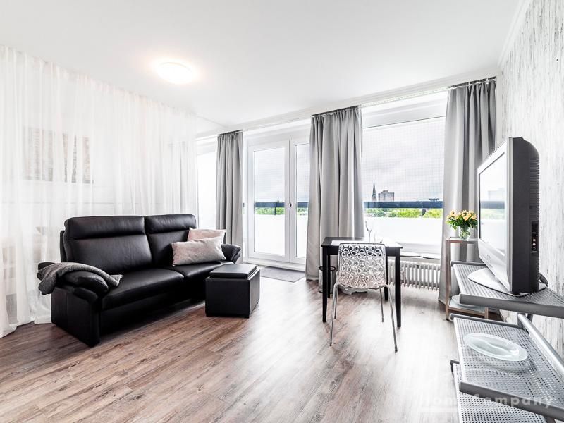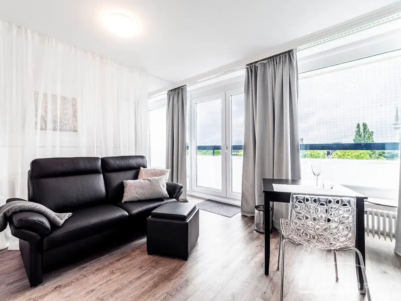 Modernes, sehr gepflegtes City-Apartment mit gehobener Ausstattung. Der sehr schöne Fußboden in warmer Holzoptik, eine zeitgemäße Wandgestaltung, ein schwarzes Ledersofa, ein bequemes Bett, eine voll ausgestattete Küche und ein sehr gepflegtes Duschbad sowie moderne Möbel und Accessoires machen das sehr helle Apartment mit Weitblick über Hamburg ideal für Geschäftsleute.