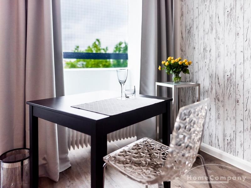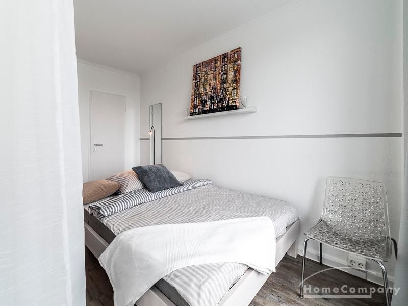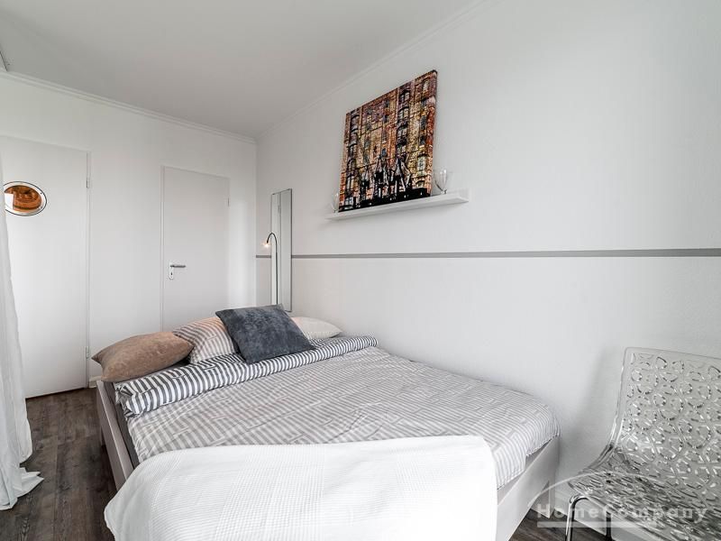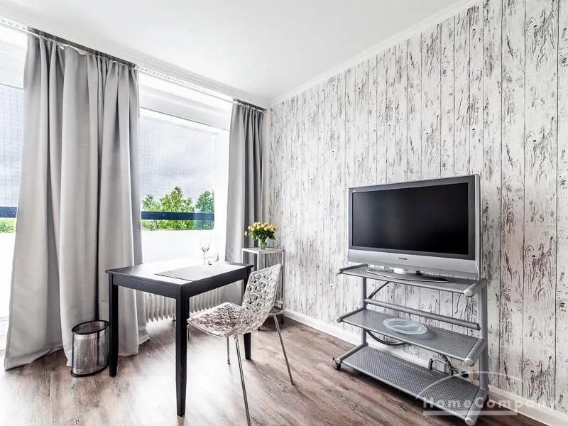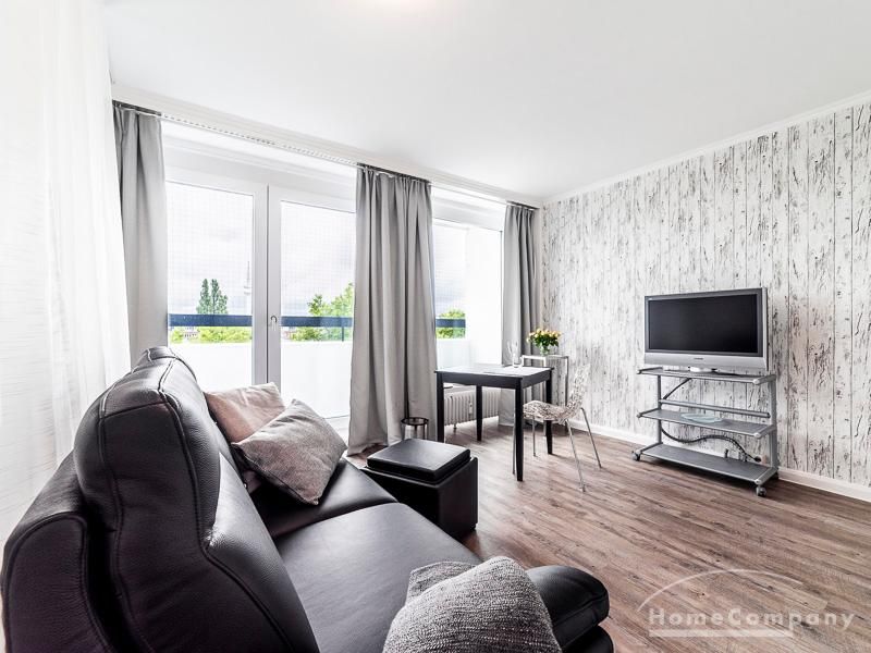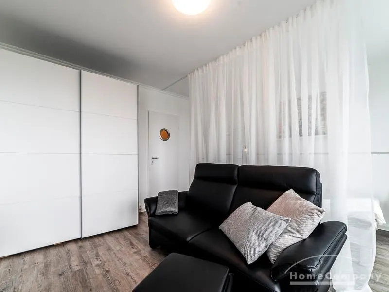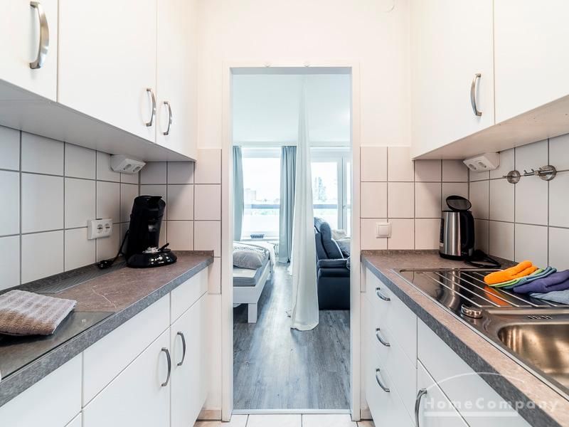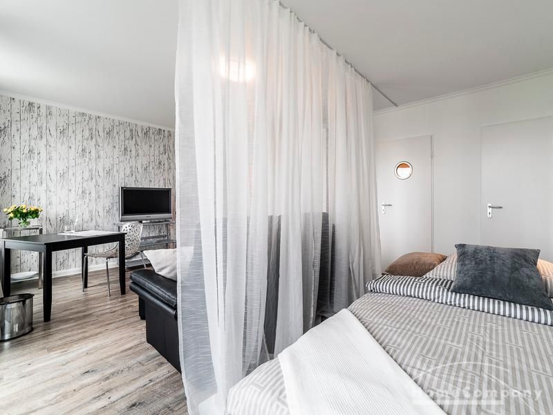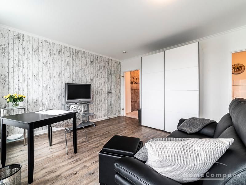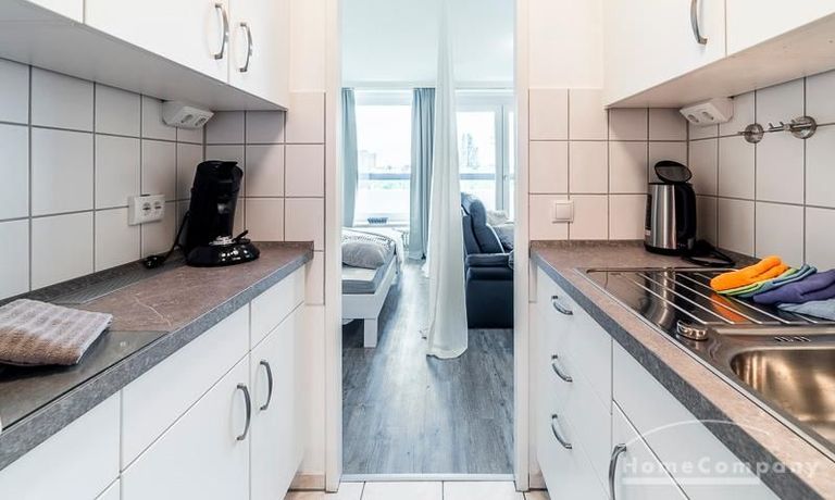 Modernes, sehr gepflegtes City-Apartment mit gehobener Ausstattung. Der sehr schöne Fußboden in warmer Holzoptik, eine zeitgemäße Wandgestaltung, ein schwarzes Ledersofa, ein bequemes Bett, eine voll ausgestattete Küche und ein sehr gepflegtes Duschbad sowie moderne Möbel und Accessoires machen das sehr helle Apartment mit Weitblick über Hamburg ideal für Geschäftsleute.