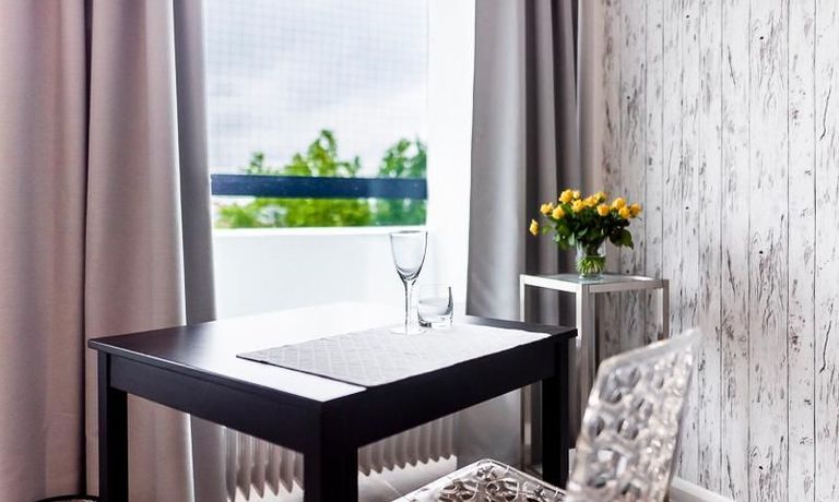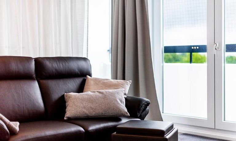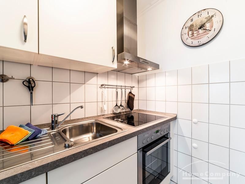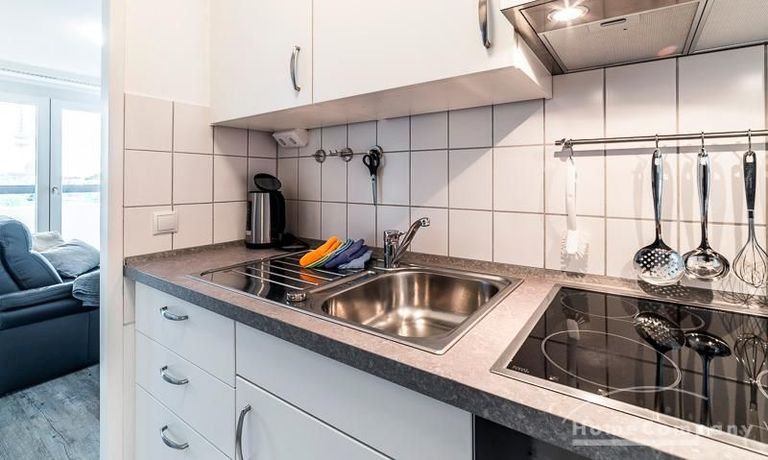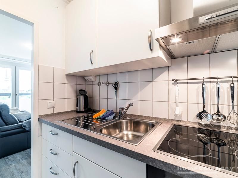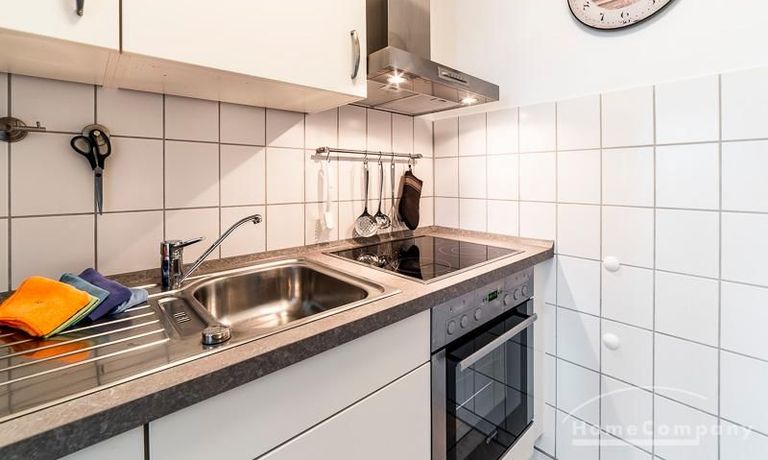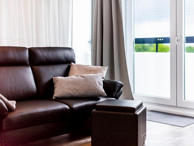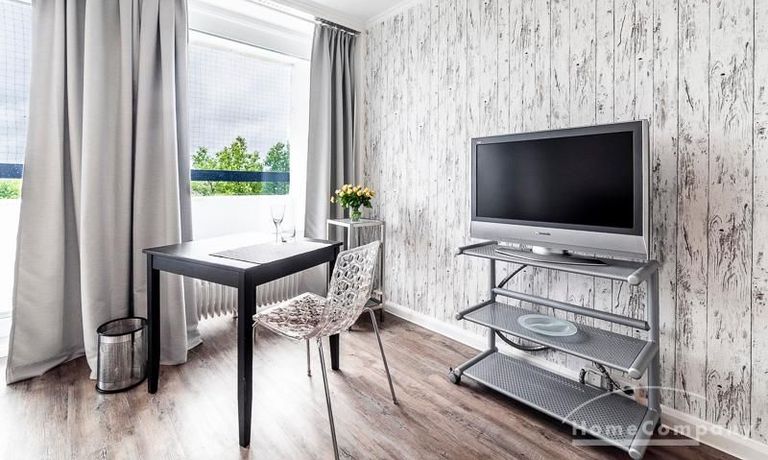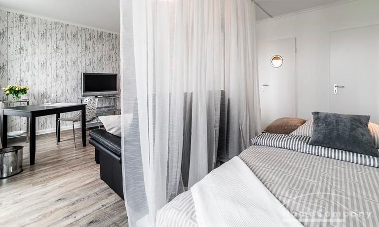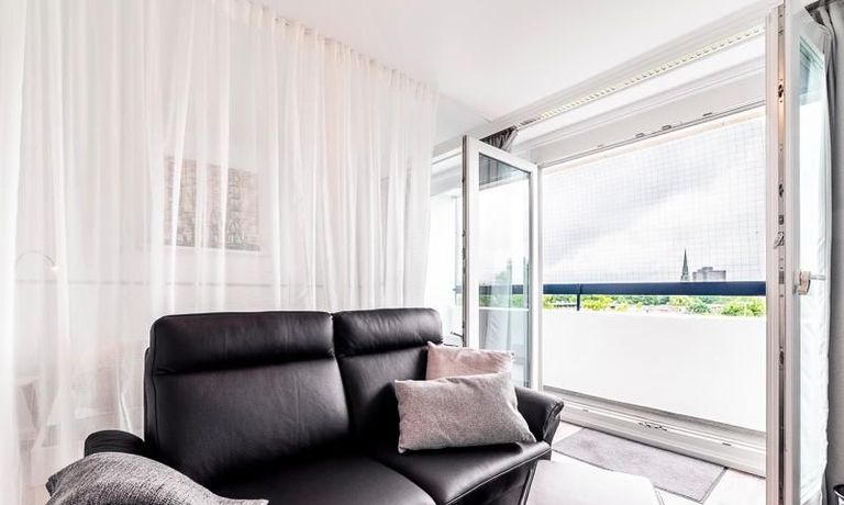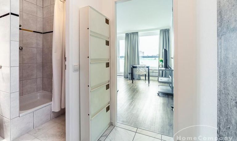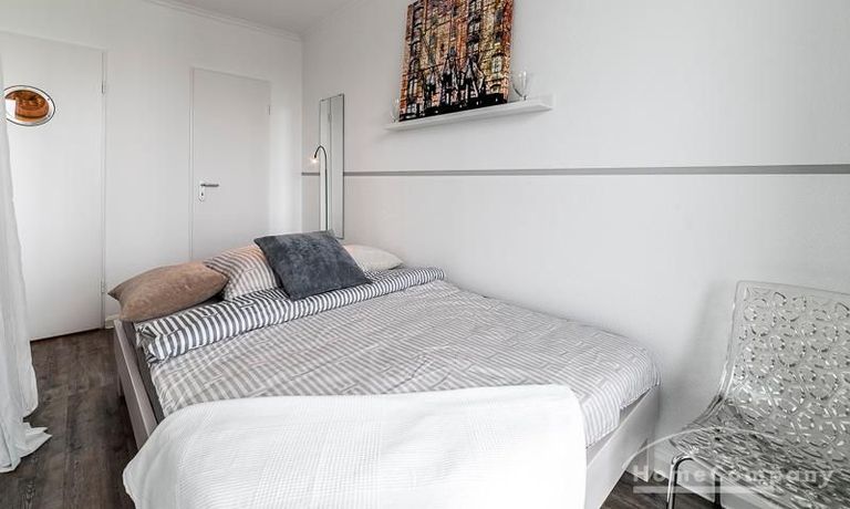 Modernes, sehr gepflegtes City-Apartment mit gehobener Ausstattung. Der sehr schöne Fußboden in warmer Holzoptik, eine zeitgemäße Wandgestaltung, ein schwarzes Ledersofa, ein bequemes Bett, eine voll ausgestattete Küche und ein sehr gepflegtes Duschbad sowie moderne Möbel und Accessoires machen das sehr helle Apartment mit Weitblick über Hamburg ideal für Geschäftsleute.