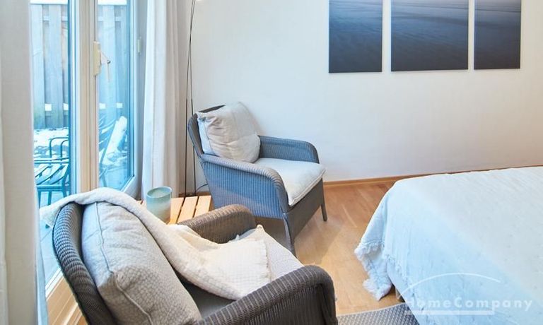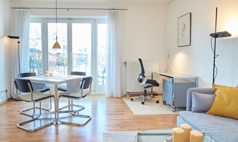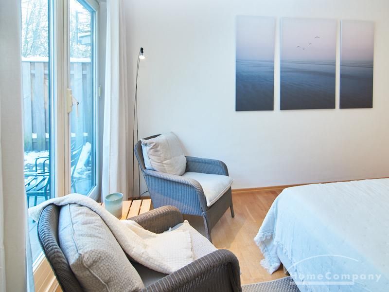 Die Wohnung ist in einer kleinen, sehr gepflegten Wohnanlage gelegen, hintere Bebauung. Es handelt sich um eine abgeschlossene Wohnanlage, ein gesicherter Zugang zum Haus ist gegeben, so dass man nur mit Schlüssel oder auf Einlass zur Wohnung gelangen kann. Vom Grundstück der Wohnanlage kann man auch direkt in den Stadtpark gelangen. Der sich mit seinem vielfältigen Angebot, wie Openair Konzerte, Naturschwimmbad, oder Wassersport (Stand up Paddeling, Rudern) auf dem See und der großen Liegewiese nutzen lässt. Die Wohnung verfügt über ein großes Wohnzimmer mit Westterrasse und ein Schlafzimmer, mit einer weiteren, nach Osten orientierten Terrasse. Die Küche hat auch einen Zugang zur Ostterrasse. Von dort bietet sich ein schöner Blick in den Gemeinschaftsgarten. Ein kleiner Bereich der Ost-Terrasse ist durch einen Mauervorsprung überdacht und damit vor Regen geschützt. Das großzügige Wohnzimmer ist mit einem gemütlichen Sofabereich und einem Esstisch ausgestattet. In der Wohnung steht ein Bereich für das Homeoffice zur Verfügung.