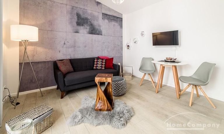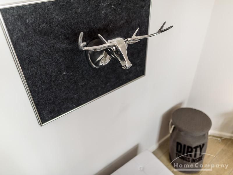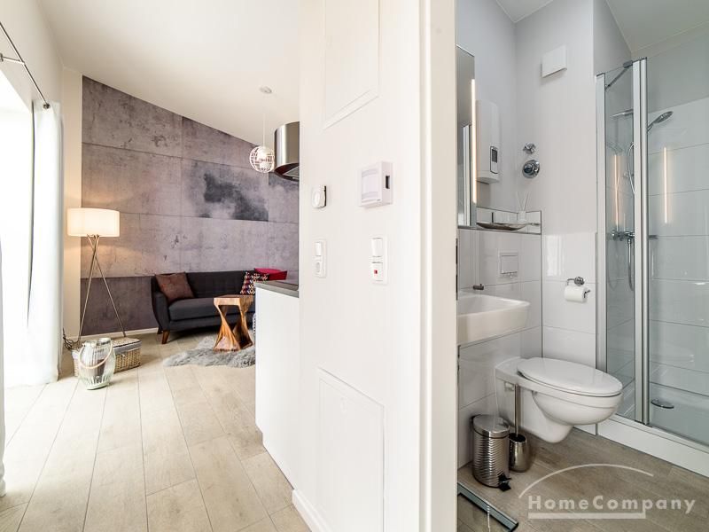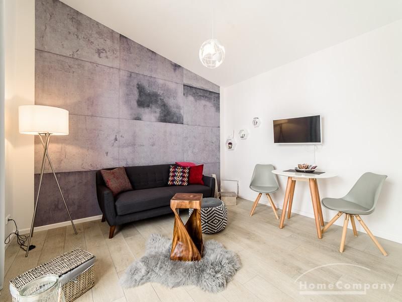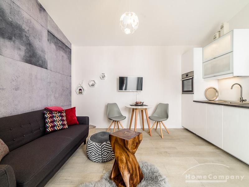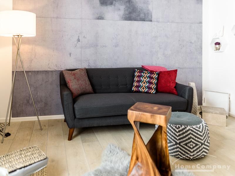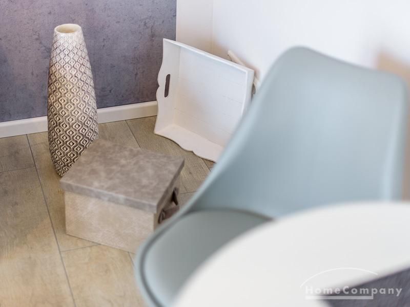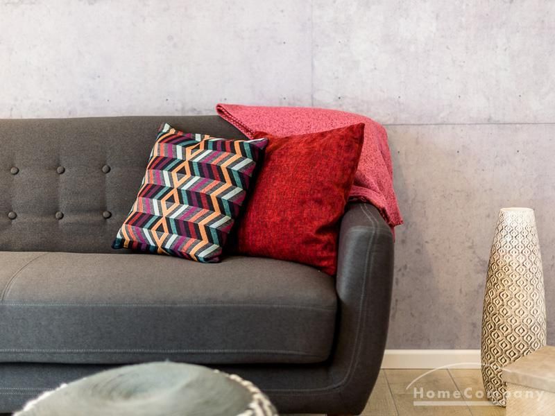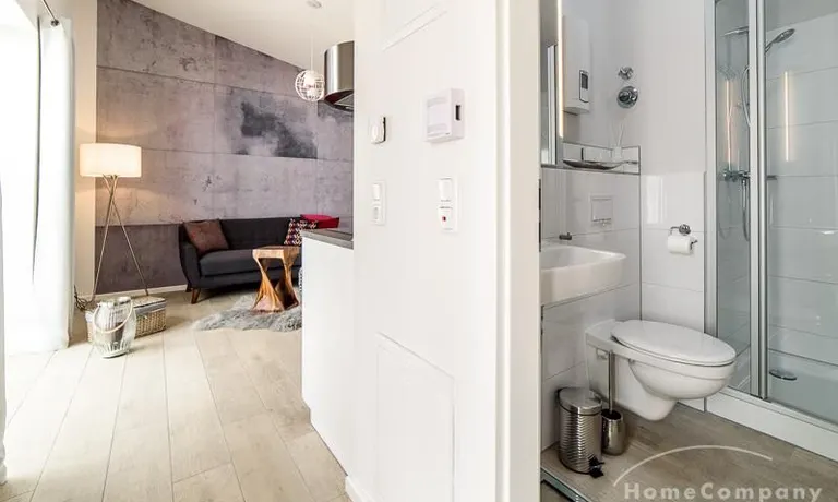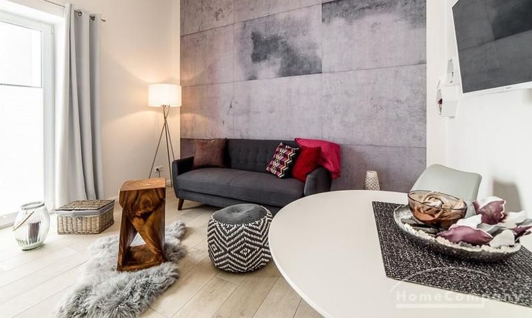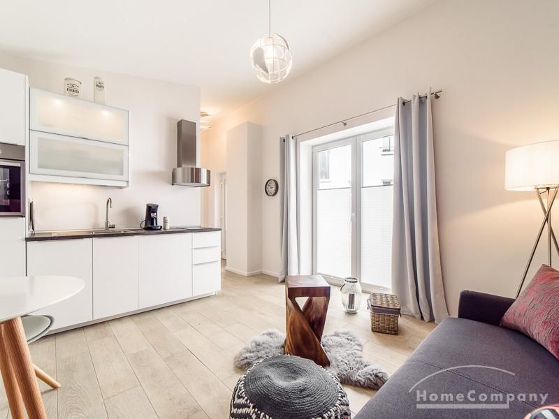 Die Wohnung ist mit Fußbodenheizung ist modern und in harmonischen Farben eingerichtet. Ein gemütliches, dunkelgraues Sofa lädt zum Entspannen ein. Der Design-Beistelltisch aus Suar-Holz mit einzigartiger Form ist ein echter Blickfang. Die Wandgestaltung, die hohen, schrägen Decken und sorgsam ausgewählte Accessoires verleihen dem Styling ein zeitgemäßes Business-Ambiente. Weitere Kontrastakzente, wie das silbergraue Lammfell und ein Stoff-Pouf lockern den Gesamtlook auf. Die offene Hochglanzküche ist zusätzlich mit einer Waschmaschine, Geschirrspüler und einer Senseo-Kaffeeautomaten ausgestattet. Das helle Badezimmer mit Fußbodenheizung, großzügiger Dusche, Personenwaage und Haartrockner bietet jeden Komfort. Das Schlafzimmer ist mit einem 1,20 großen Boxspringbett und einem 2,70 großen Kleiderschrank mit weiteren Innenschubladen ausgestattet. Maßangefertigte Plissees, welche in jeder Position von oben und unten einstellbar sind, bieten edlen Sicht- und Sonnenschutz an allen Fenstern und sorgen für sanft abgefiltertes, natürliches Licht im Zimmer. Zusätzliche Vorhänge schaffen auch in den Abendstunden ein angenehmes Ambiente. Die Wohnung hat eine Terrasse und befindet sich im absolut ruhigen Innenhof einer kaum befahrenen Seitenstraße, nur 1,2 km vom Dammtorbahnhof und der Innenstadt entfernt.