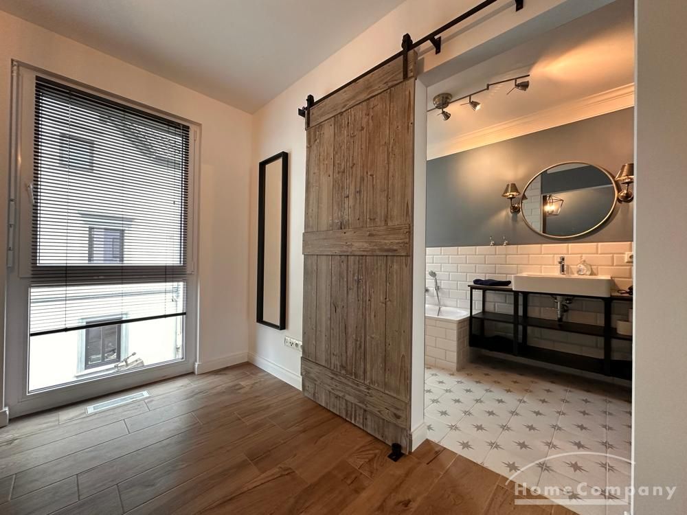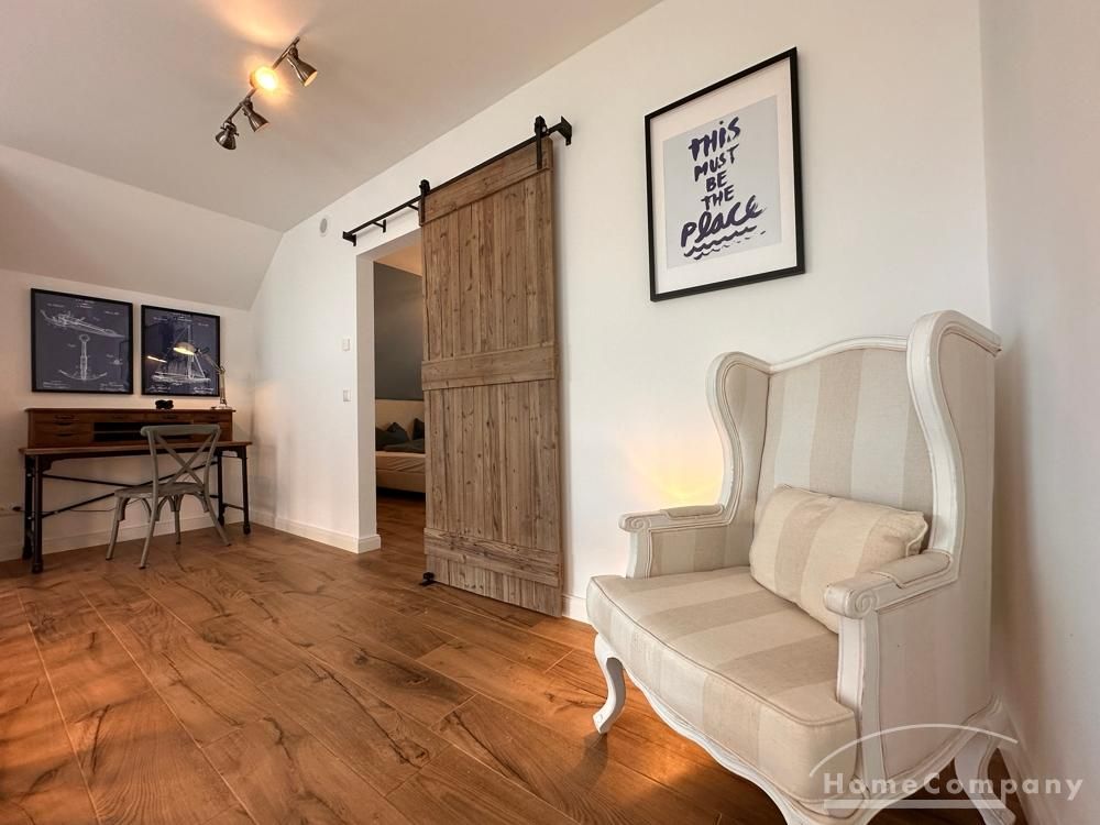 Hier befindet sich den Flur mit Schreibtisch, Bürostuhl, ein charaktervolles Sessel und das Schlafzimmer mit 180cm Bett, Ankleide und mit Zugang zum Badezimmer mit Fenster, Dusche und Badewanne.