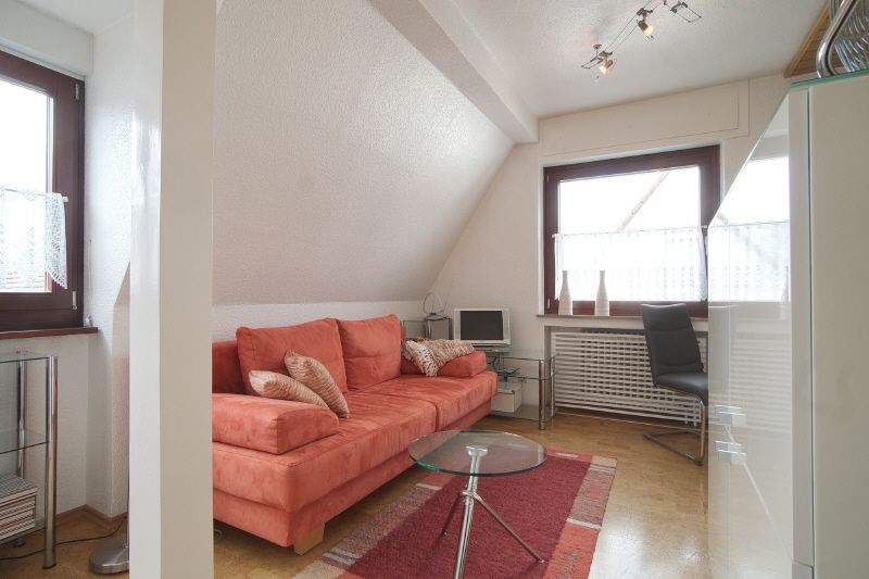 Hochwertige Einrichtung, komplette Ausstattung. Lichtdurchflutete Räume, Fenster mit programmierbaren elektrischen Rolläden, Kork- bzw. Teppichboden. Die Wohnung hat ein helles, kleines Duschbad mit Fenster und Spiegelschrank. Wohnraum mit Sofa, DVB-T-TV, offen anschließende Küche mit Einbauküche inklusive E-Herd/Backofen, Microwelle, Kühlschrank mit Eisfach, Geschirr, Senseo-Kaffeemaschine und Kochutensilien. Ansprechender Essplatz für zwei Personen.. Das Schlafzimmer liegt im ausgebauten Spitzboden und wird vom Wohnbereich über eine Treppe betreten. Dort stehen ein komfortables Bett, Kleiderschrank und weitere Unterbringungsmöglichkeiten bereit.