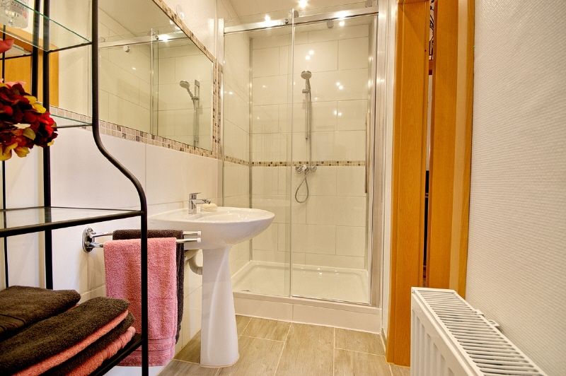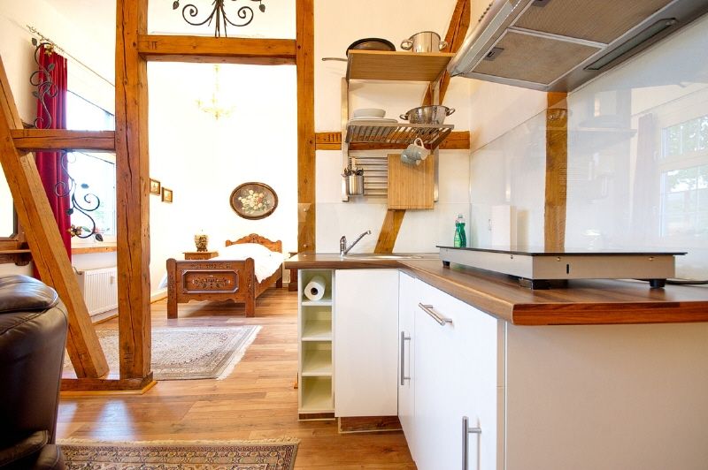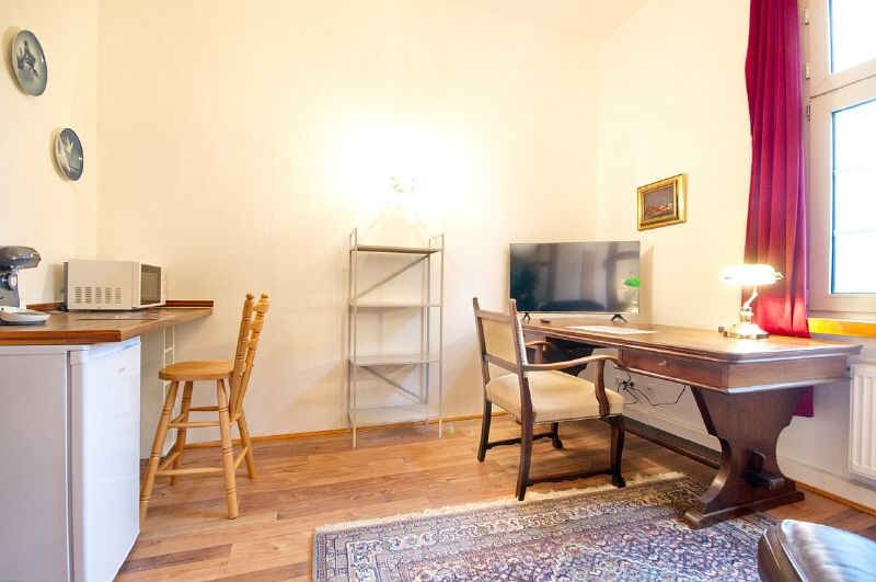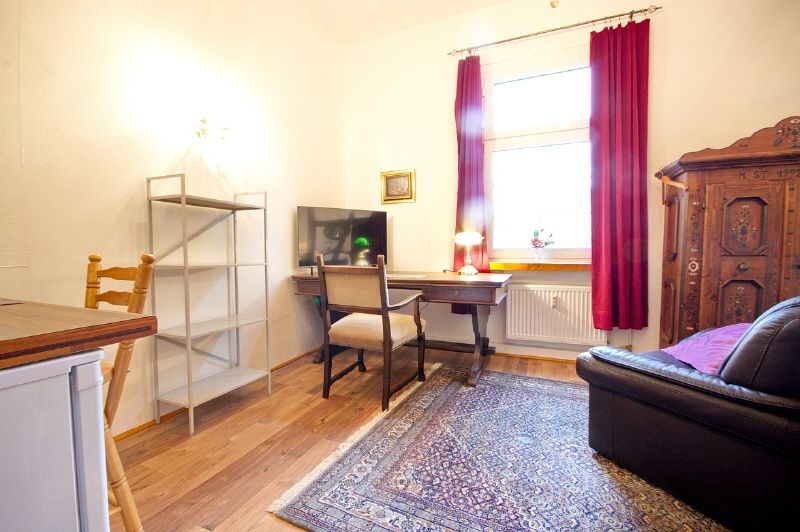 Modern-gemütliche, gute und komplette Ausstattung. Internetzugang ist über W-LAN möglich. Kombinierter Wohnschlafraum mit Laminatboden, Einzelbett, Kleiderschrank, Flachbild-TV mit DVB-T-Antenne, Arbeitsecke mit großem Schreibtisch. Offen anschließender Kochbereich mit Induktions-Doppelkochfeld, Microwelle, Kaffeemaschine, Kühlschrank und Geschirr. Das Duschbad ist hell gefliest, Handtuchheizung, eingebaute Halogenstrahler. Eine Waschmaschine steht in einem separaten Raum auf der Etage zur Nutzung zur Verfügung.