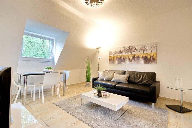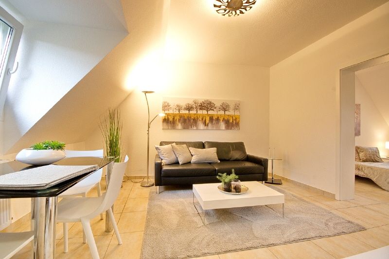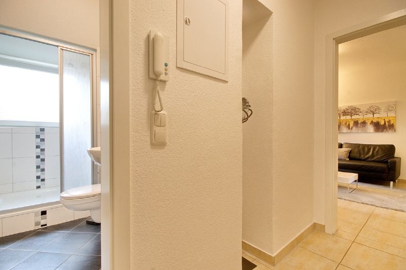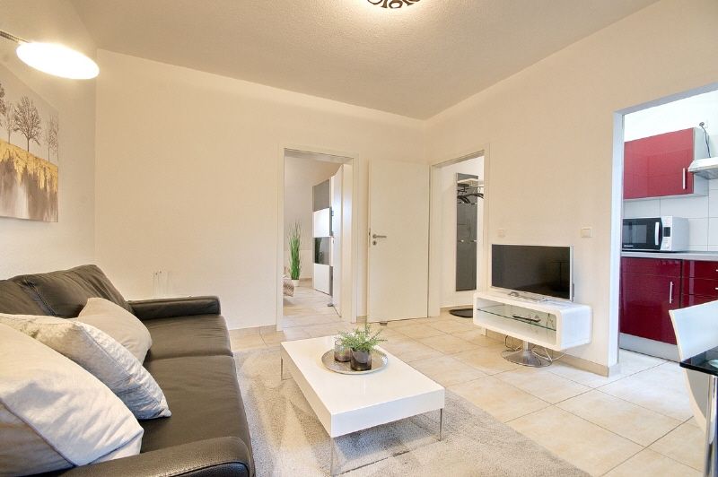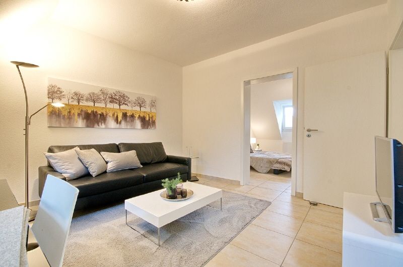 Moderne und gehobene Einrichtung, heller Fliesenboden. Highspeed-Internetzugang über W-LAN möglich (1000 Mbit-Anschluss). Neues Duschbad mit Fenster, Glaswand, Handtuchheizung. Wohnzimmer mit Sofa, internetfähiges TV-Gerät (auch SAT-TV Astra und Eutelsat) und Essbereich, angrenzender Kochbereich mit neuer Einbauküche. Schlafzimmer mit 1,60 m breitem Bett und Kleiderschrank. Die Wohnung ist komplett ausgestattet, bis hin zu Bettwäsche und Handtüchern. Waschmaschine und Trockner stehen in der Waschküche des Hauses zur Nutzung zur Verfügung.