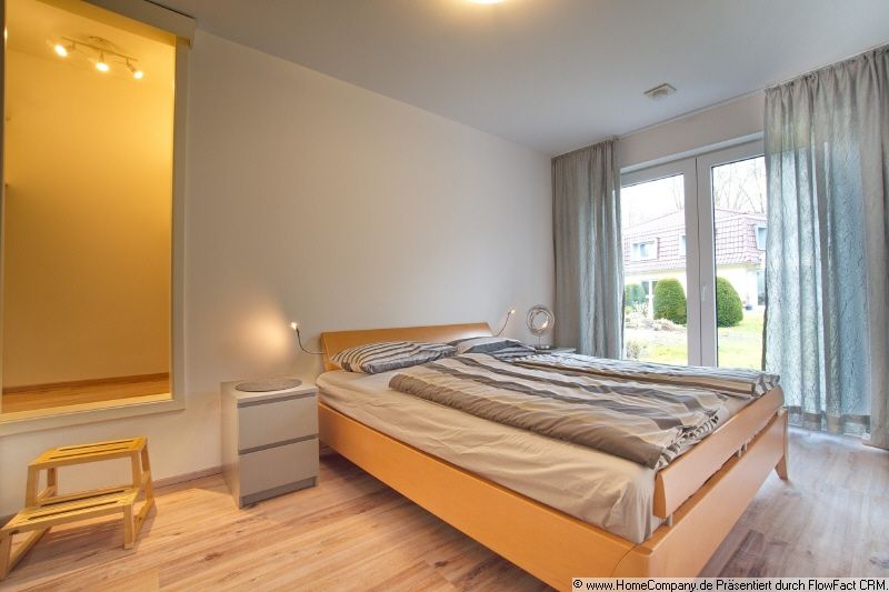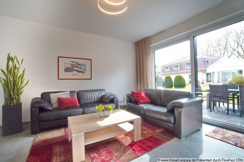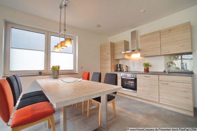 The apartment features high quality fittings and furnishings throughout. In the spacious living area, two leather sofas invite you to relax. A modern sideboard with TV, as well as a large dining table with six chairs, complete the picture. The open-plan kitchen is fully equipped with an oven, ceramic hob, coffee machine, kettle, toaster, microwave, dishwasher and much more. The bedroom is furnished with a bed (1.80m x 2.00m) and walk-in wardrobe, offering maximum comfort and plenty of storage space. Floor-level windows offer a magnificent view of greenery. The guest room is furnished with a sofabed (1.00m x 2.00m). Large terrace with table and six chairs, inviting you to while away the time. Even the bathroom delights, thanks to its modern design. The window provides the bright atmosphere, and the combination of bath and shower cater for all requirements. Further highlights of the property include electric shutters and cosy underfloor heating. A separate utility room houses the washing machine, providing additional convenience. Internet access (up to 50 Mbit) already included in the rent. Start your 360° tour here: https://tour.feelestate.com/view/fullscreen/id/VZ5QL/