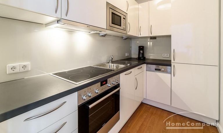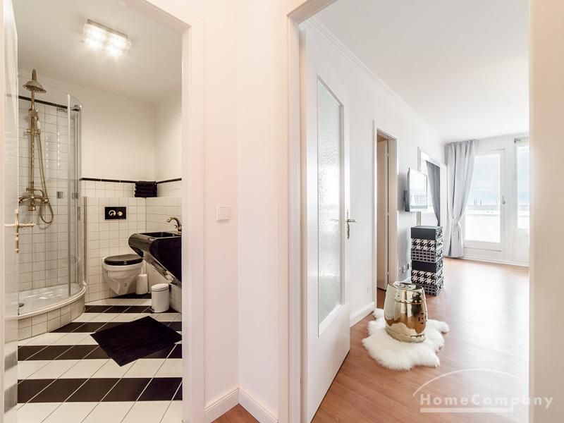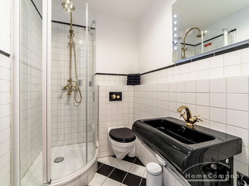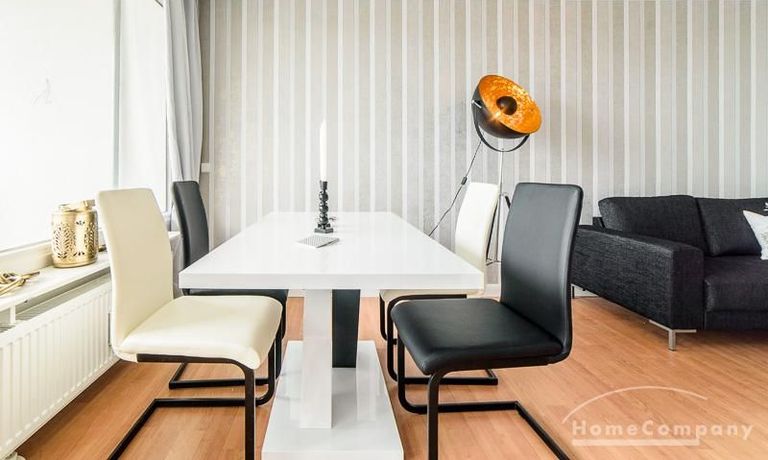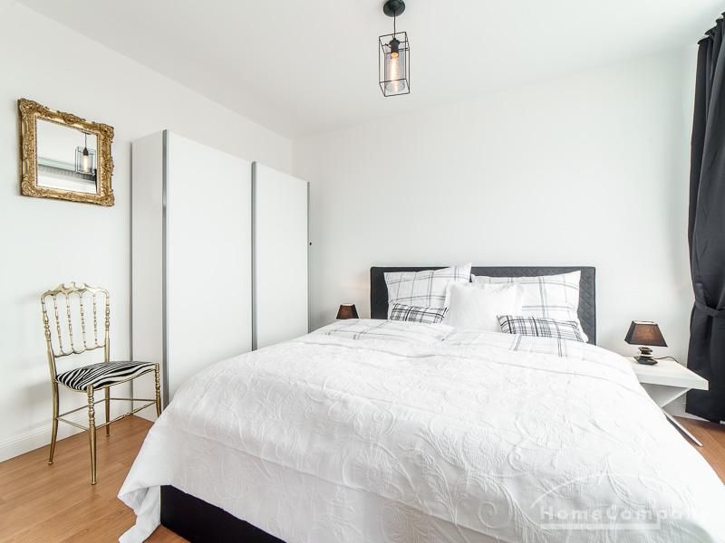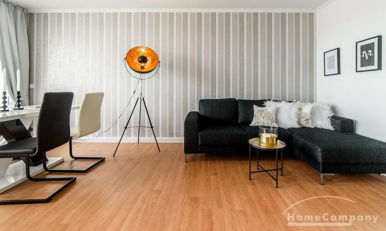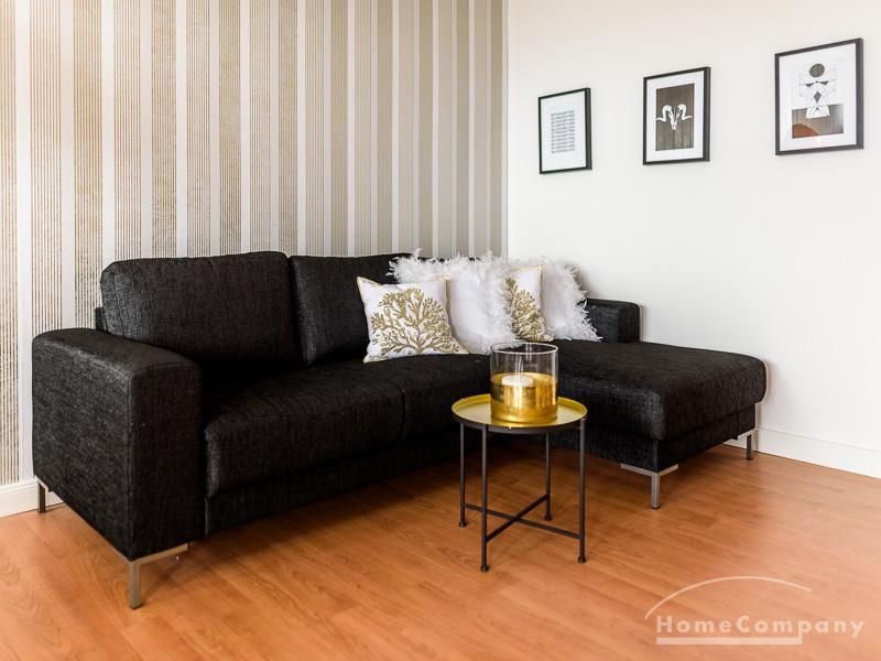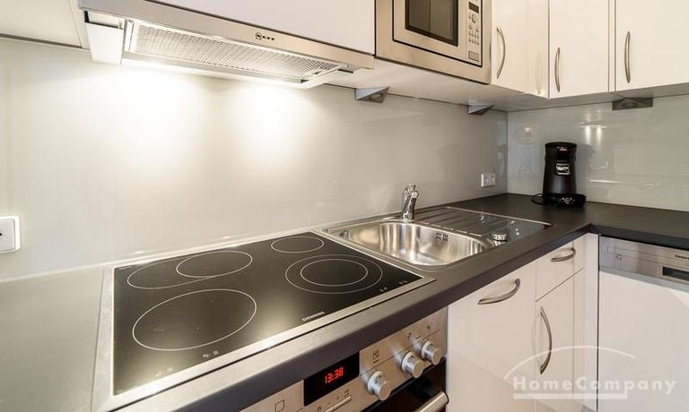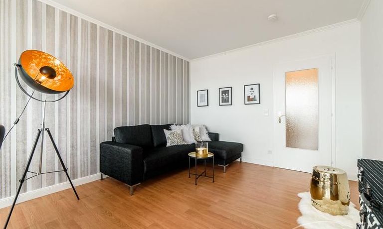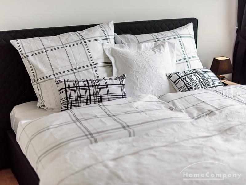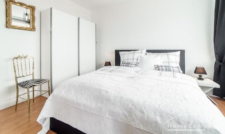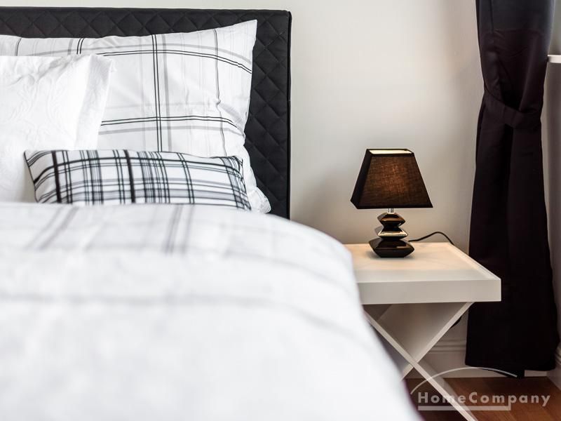 Die offen gehaltenen Räume und die ausgefallene, extravagante Einrichtung, gehalten in schwarz-weiß ergänzt mit gezielt eingesetzten goldenen Stilelementen, verleiht dieser Businesswohnung ein besonderes Ambiente. Die hochwertige Einbauküche mit Hochglanzfront ist ausgestattet mit einem Herd, Backofen, Geschirrspüler, einer Kaffeepadmaschine und einer Mikrowelle. Im offenen Schlafzimmer steht ein 1,60 m breites, komfortables Boxspringbett und ein großzügiger Kleiderschrank. Im Badezimmer, ebenfalls in schwarz-weiß-gold gehalten, steht eine Waschmaschine zur Verfügung.