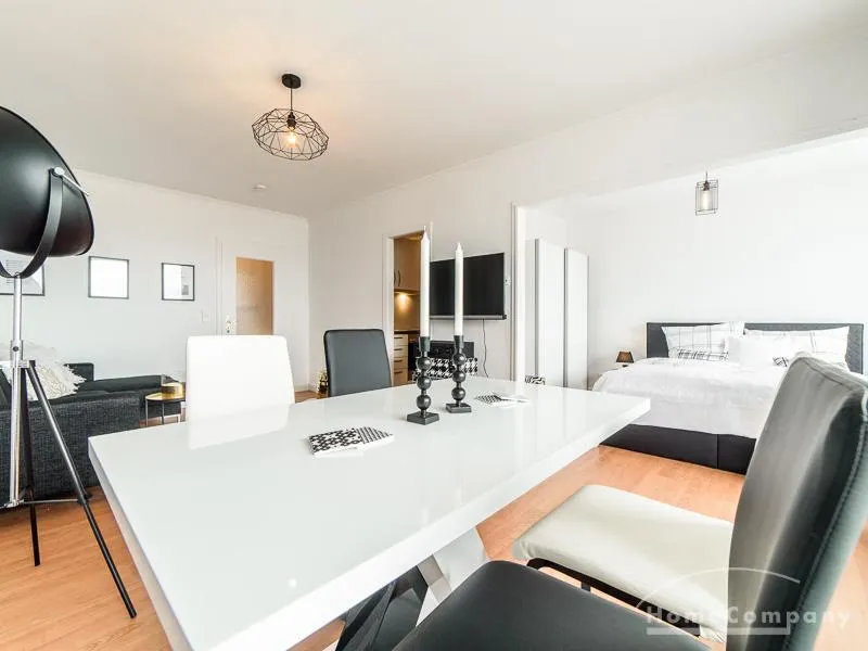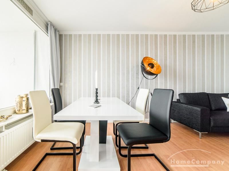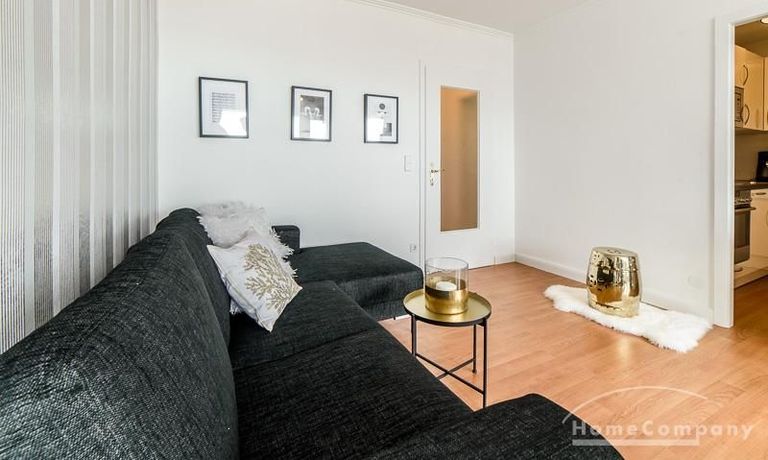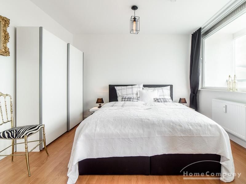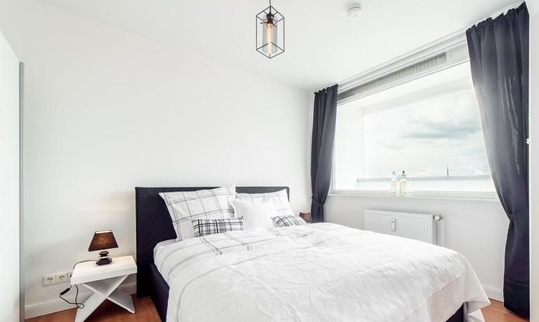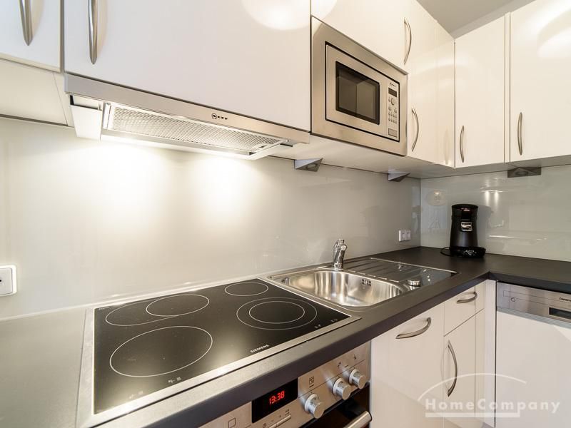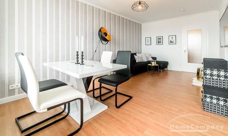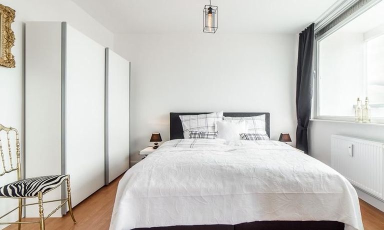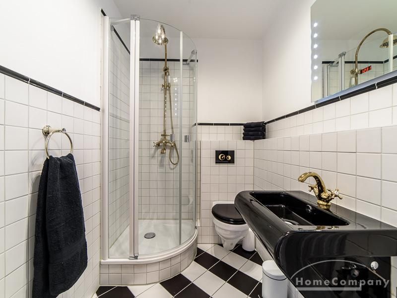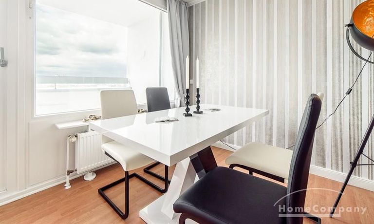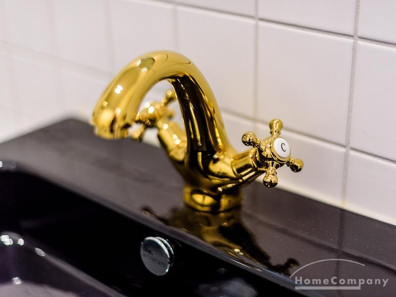 Die offen gehaltenen Räume und die ausgefallene, extravagante Einrichtung, gehalten in schwarz-weiß ergänzt mit gezielt eingesetzten goldenen Stilelementen, verleiht dieser Businesswohnung ein besonderes Ambiente. Die hochwertige Einbauküche mit Hochglanzfront ist ausgestattet mit einem Herd, Backofen, Geschirrspüler, einer Kaffeepadmaschine und einer Mikrowelle. Im offenen Schlafzimmer steht ein 1,60 m breites, komfortables Boxspringbett und ein großzügiger Kleiderschrank. Im Badezimmer, ebenfalls in schwarz-weiß-gold gehalten, steht eine Waschmaschine zur Verfügung.