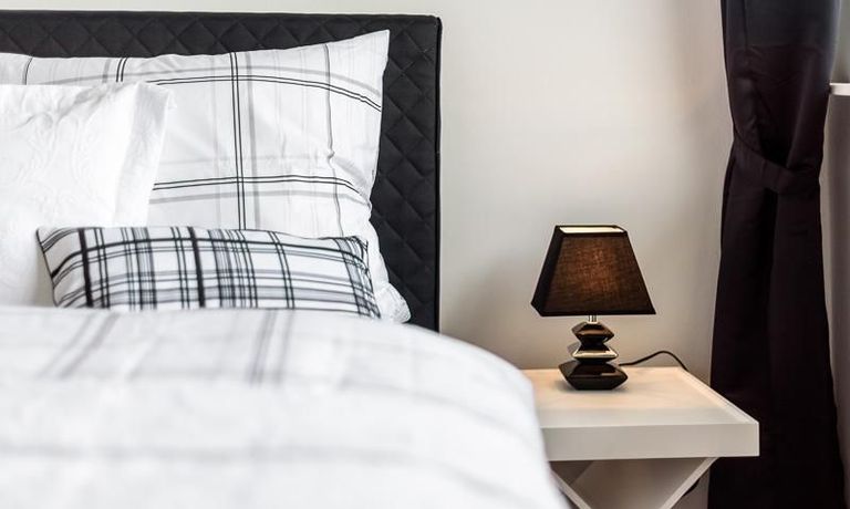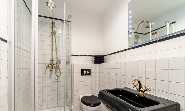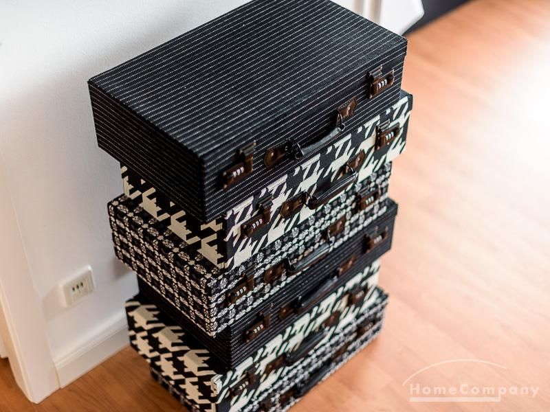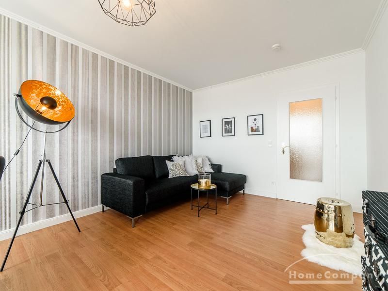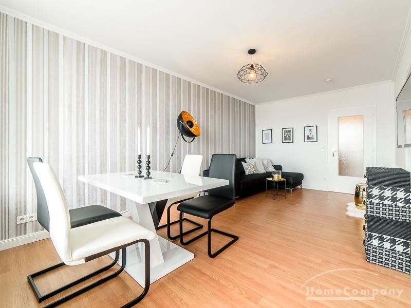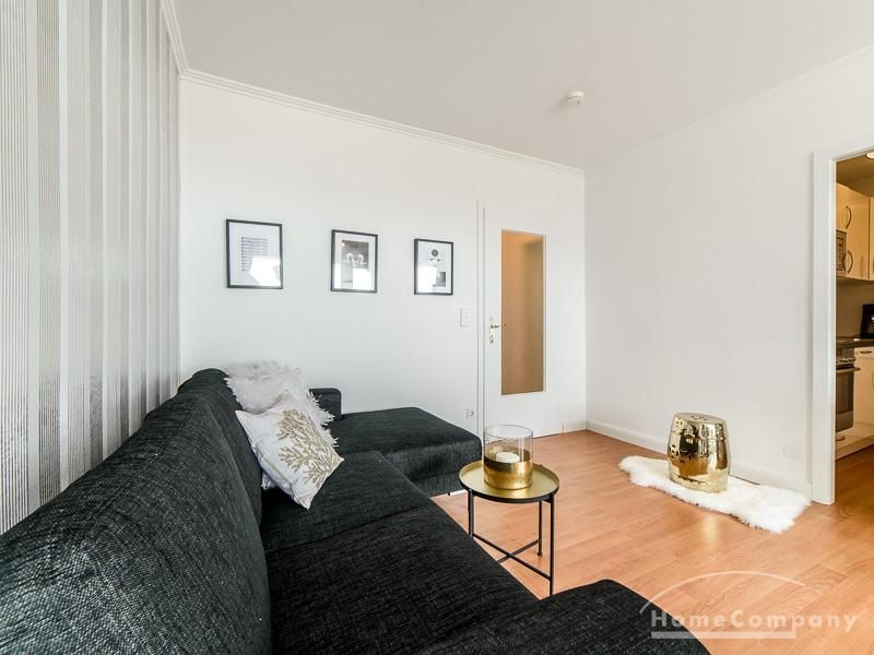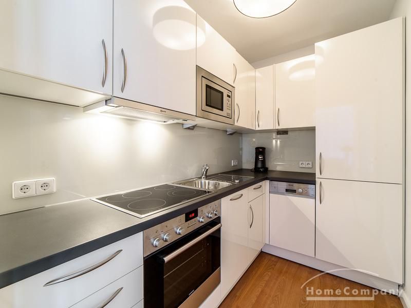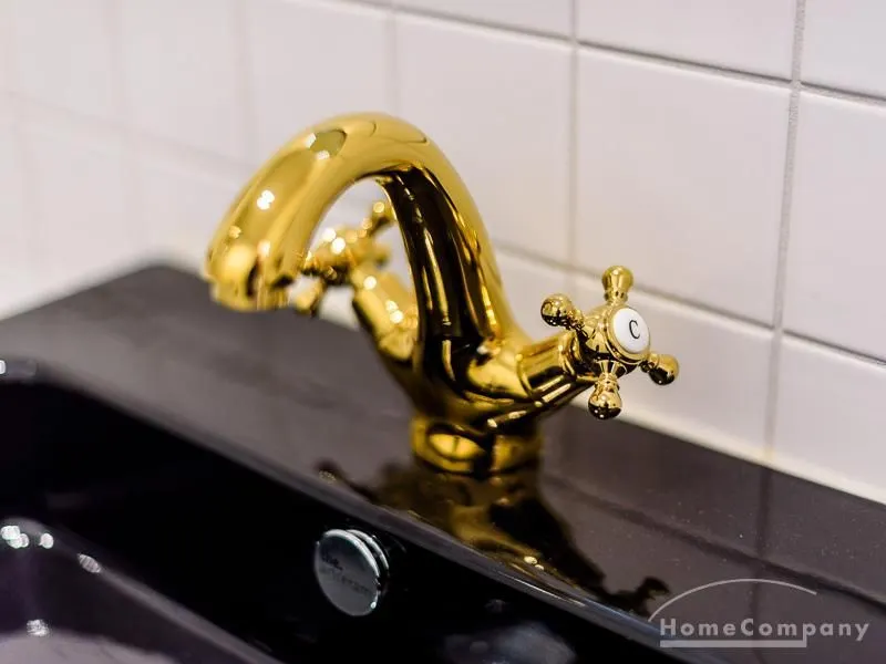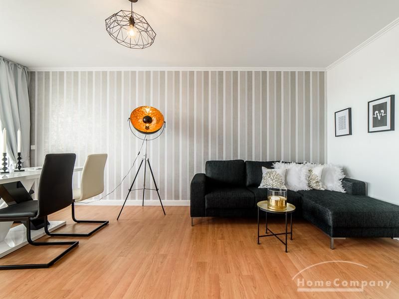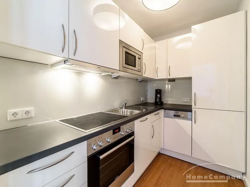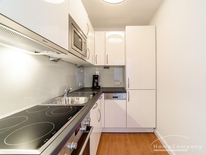 Die offen gehaltenen Räume und die ausgefallene, extravagante Einrichtung, gehalten in schwarz-weiß ergänzt mit gezielt eingesetzten goldenen Stilelementen, verleiht dieser Businesswohnung ein besonderes Ambiente. Die hochwertige Einbauküche mit Hochglanzfront ist ausgestattet mit einem Herd, Backofen, Geschirrspüler, einer Kaffeepadmaschine und einer Mikrowelle. Im offenen Schlafzimmer steht ein 1,60 m breites, komfortables Boxspringbett und ein großzügiger Kleiderschrank. Im Badezimmer, ebenfalls in schwarz-weiß-gold gehalten, steht eine Waschmaschine zur Verfügung.