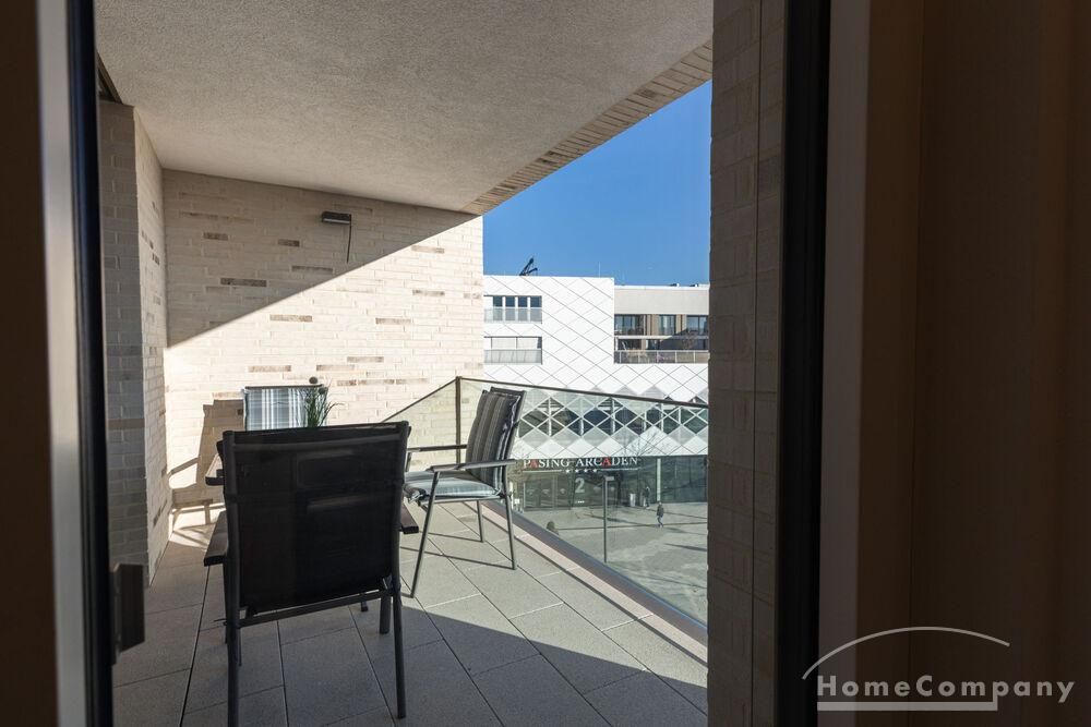 Von der Küche und dem Wohnzimmer aus ist der Balkon direkt begehbar und bietet einen schönen Ausblick auf den Pasing-Arcaden-Platz. Das Hauptschlafzimmer mit Doppelbett und Kleiderschrank verfügt über ein elegantes En-suite-Bad mit Badewanne.