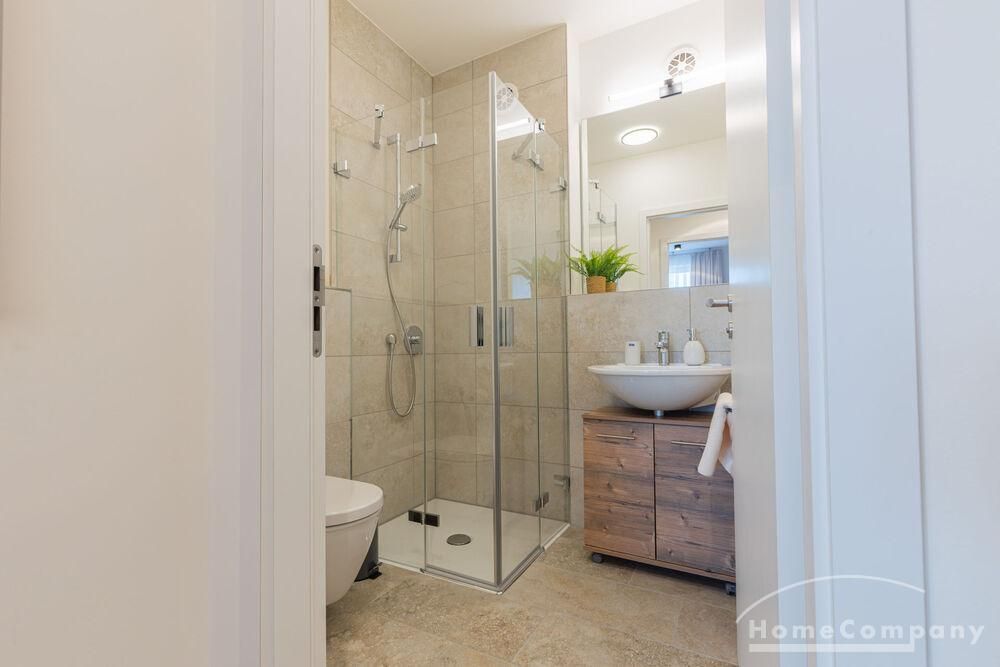 Ein weiteres Zimmer ist als Büro mit Schlafcouch und Kleiderschrank eingerichtet und eignet sich sowohl als Homeoffice als auch als Gästezimmer. Ergänzt wird die Wohnung durch ein Gästebad mit Dusche.