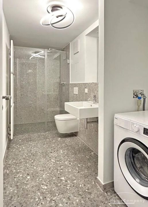 – Modernes Badezimmer mit ebenerdiger Dusche und integrierter Waschmaschine