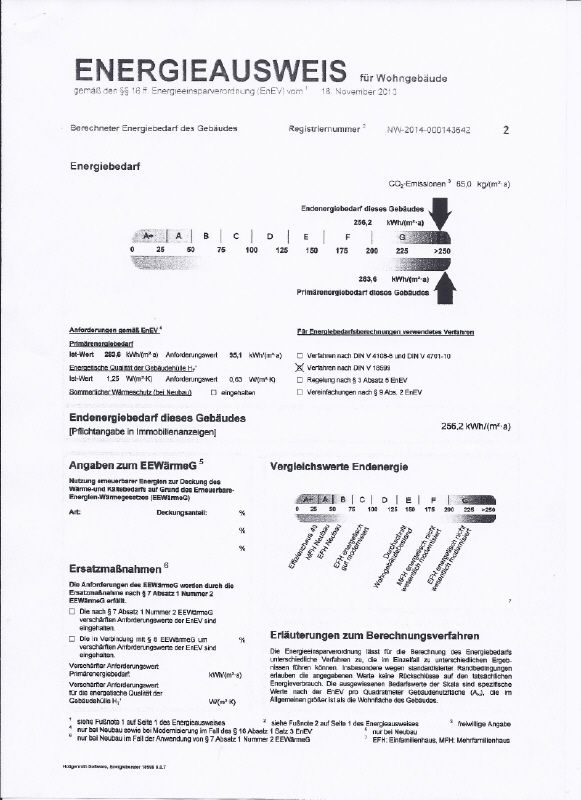 Angaben zum Energieausweis: Baujahr des Hauses: 1896, Energiebedarfsausweis, Wert: 256,2 kWh/(m²*a), Energieeffizienzklasse gemäß Energieausweis und EnEV 2014: G.