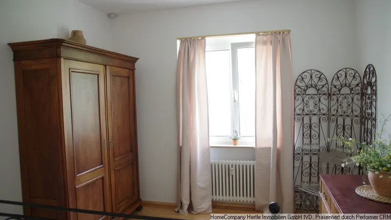 Doppelbett, großer Holzkleiderschrank, Metallregal, 2 Nachttische mit kleiner Nachtlampen, Wäschekiste, kleiner Stuhl, diverse Dekorationen, Bettwäsche, Decken und Kissen