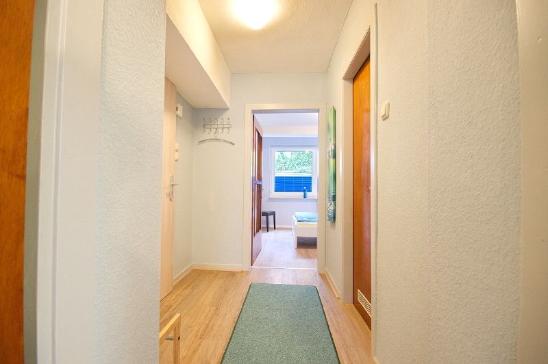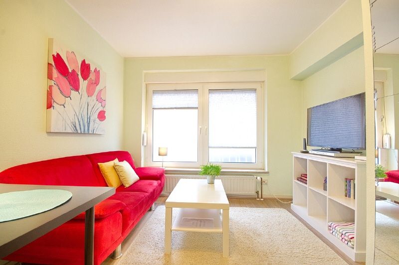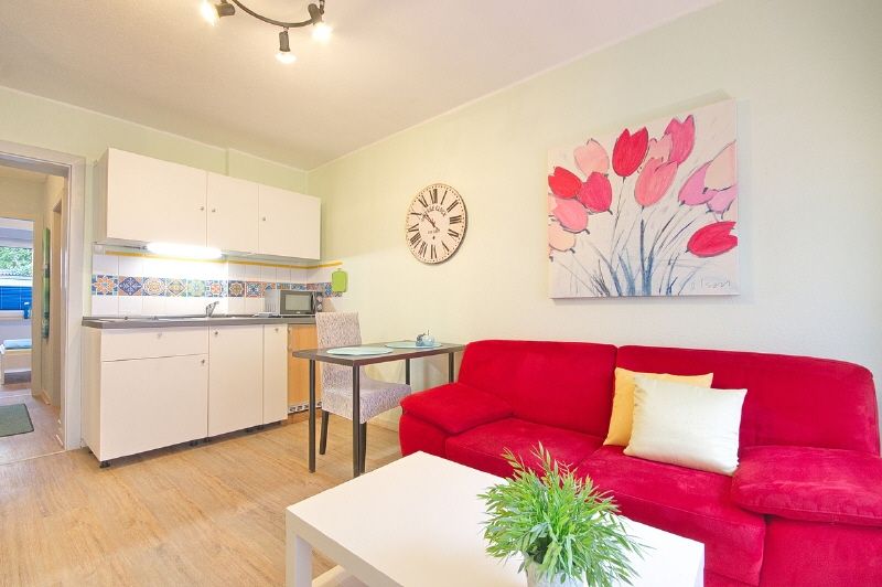 Komplette Möblierung und Ausstattung inklusive Bettzeug, Wäsche, Geschirr etc. Neues und geschmackvoll gestaltetes Bad (2013) mit Glas-Eckdusche, WC wandhängend, Wohnzimmer mit Sofa, Sideboard und TV mit DVB-T2 Empfang, DVD-Player. Eine Küchenzeile mit Essbereich ist im Wohnbereich integriert. Schlafzimmer mit 1,40 m Bett und Kleiderschrank. Internetzugang vorhanden. Waschmaschine und Trockner befinden sich im Keller und können gegen eine Gebühr genutzt werden.